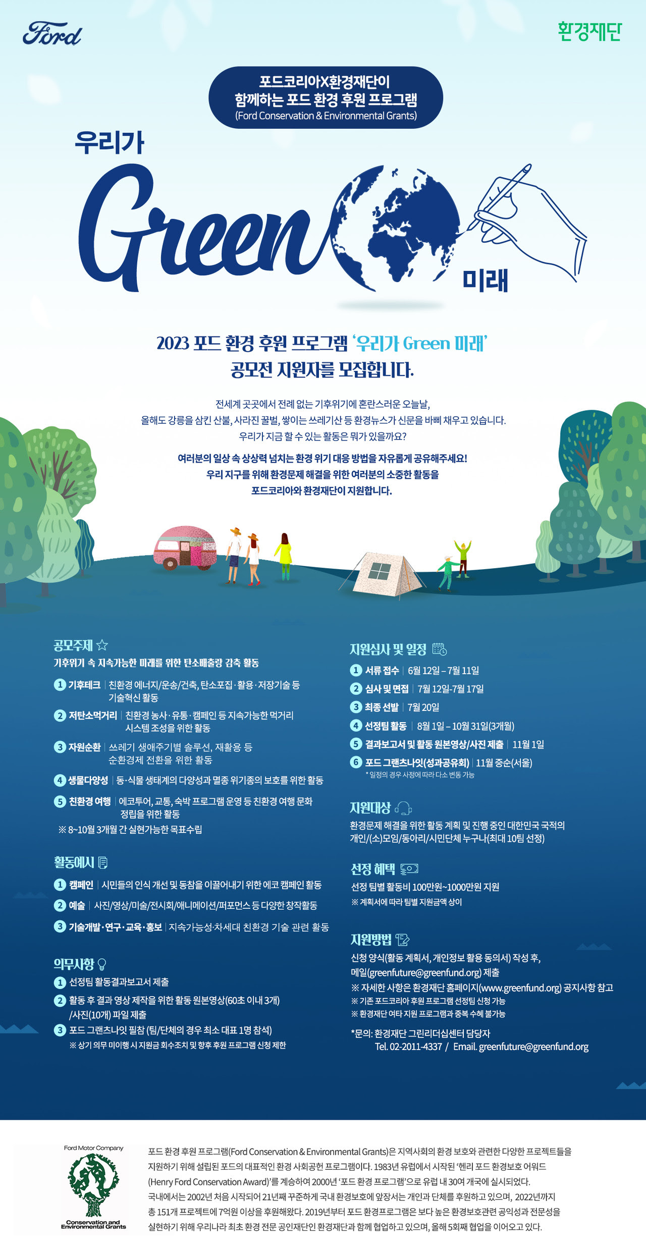 환경재단이 포드세일즈서비스코리아(이하 포드코리아)와 6월 12일부터 7월 11일까지 ‘2023 포드 환경 후원 프로그램: 우리가 GREEN 미래’ 지원자를 모집한다.