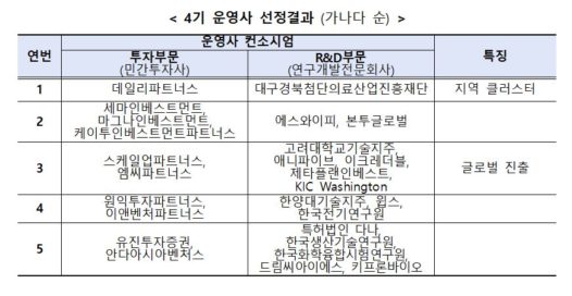 중소벤처기업부(장관 이영)는 스케일업 팁스(TIPS, Tech Investor Program for Scale-up) 4기 운영사로 5개 컨소시엄을 선정했다고 밝혔다. 스케일업 팁스란 급변하는 기술·시장 수요 변화에 대응하기 위한 민간주도 방식의 R&D수단으로, 민간 운영사(VC+연구개발전문회사컨소시엄)가 스케일업 단계 유망기업을 발굴해 선 투자하면 정부가 후 매칭 지원하는 프로그램이다. ’21.11월부터 올해 5월까지 운영사를 통해 66개 기업을 선정하였으며, 운영사 투자 981억원에 매칭하여 정부가 지분투자와 출연R&D를 합쳐 772억원을 지원했다. 사업 초기임에도 코스닥 상장 등 성과도 나오고 있다. 4기 운영사 선정을 위해 3월 23일 운영사 모집공고를 거쳐 접수된 10개 컨소시엄을 대상으로 서면평가, 현장실사, 대면평가 3단계의 검증을 진행하였다. 또 제조·하드웨어, 지역기업 투자 능력, 글로벌 지원역량, 딥테크 팁스 연계능력 등을 주요하게 평가하여 상위 5개 컨소시엄을 최종 선정했다. 이번에 4기 운영사로 선정된, 데일리파트너스는 바이오헬스 전문 투자사로 대구경북첨단의료산업진흥재단과 협업 경험을 바탕으로 지역 클러스터 기반 스케일업 지원이 기대된다. 공공기술 사업화에 강점이 있는 세마인베스트먼트, 에스와이피는 마그나인베스트먼트, 케이투인베스트먼트파트너스, 글로벌 컨설팅이 강점인 본투글로벌과 함께 시너지를 창출할 계획이다. 특히 스케일업파트너스와 엠씨파트너스는 첨단 산업분야의 풍부한 투자 경험과 네트워크를 바탕으로 고려대학교기술지주, 애니파이브, 이크레더블, 제타플랜인베스트와 KIC Washington 등과 함께 기술사업화 및 글로벌 진출 솔루션을 제공할 계획이다. 아울러 지역소재 소부장 투자 전문성을 보유한 원익투자파트너스와 이앤벤처파트너스는 한양대기술지주, 윕스, 한국전기연구원의 사업화 컨설팅, BI인프라, 연구개발 노하우를 활용할 예정이다. 또한 유진투자증권과 안다아시아벤처스는 R&D전주기, 시험인증, 임상 등 역량을 보유한 특허법인 다나, 한국생산기술연구원, 한국화학융합시험연구원, 드림씨아이에스, 키프론바이오과 함께 시너지를 낼 것으로 기대된다. 한편 선정된 운영사들은 협약을 거쳐 하반기부터 활동 예정이며, 클러스터 입주기업 배정물량 확대* 등 클러스터 TIPS를 운영하고, 고위험·고성과 R&D 프로젝트도 진행한다. 이영 장관은 “클러스터 기반 혁신 생태계를 활성화하고, 중소벤처기업이 고위험 R&D에 과감하게 도전할 수 있도록 스케일업 팁스를 통해 유망기업들의 혁신을 적극 뒷받침하겠다”고 밝혔다. 관련 기사 더 보기 https://www.venturesquare.net/884338