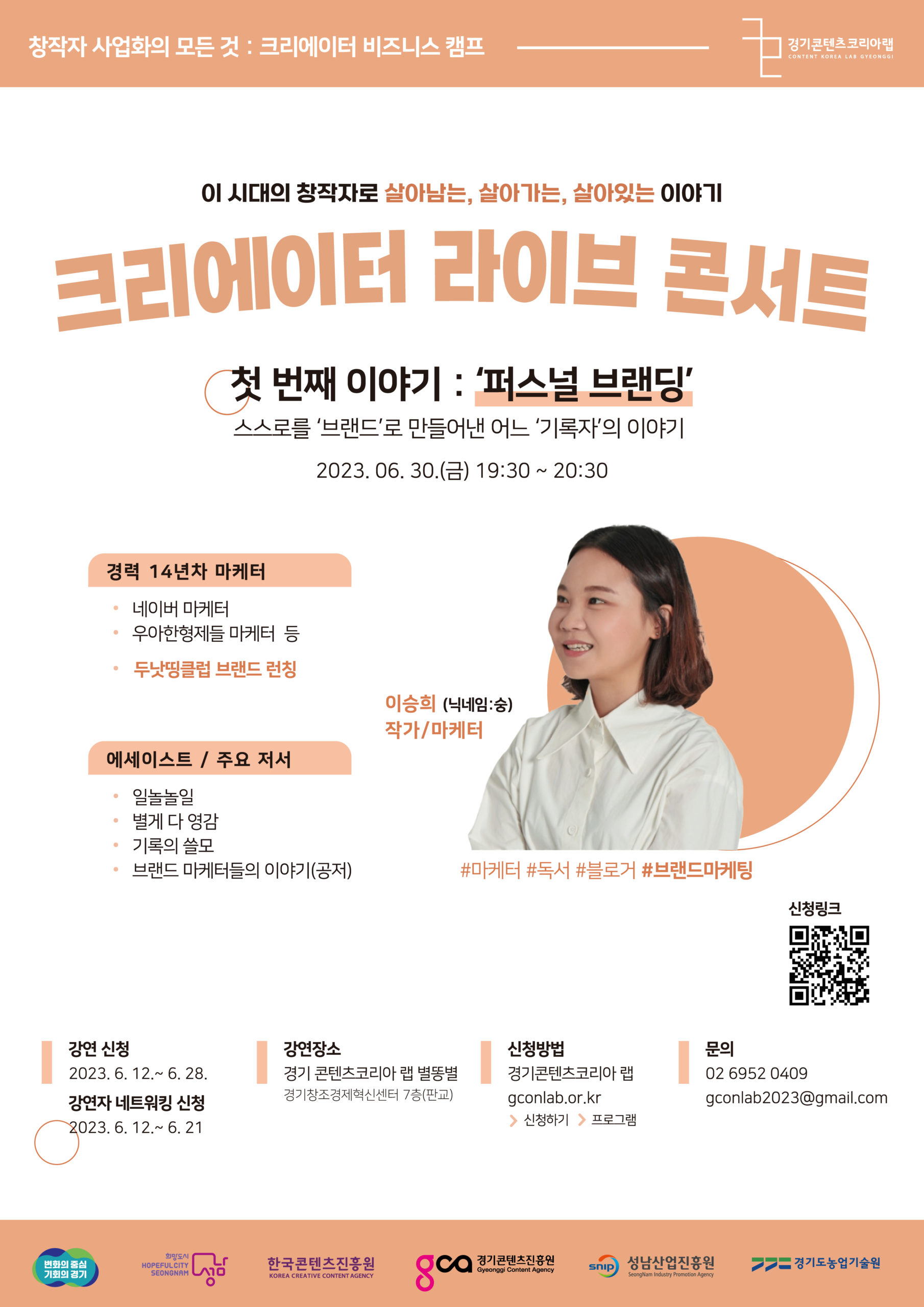 6월 30일 첫 번째 강연은 14년차 마케터이자 작가로 활동하며 자신의 브랜드 ‘두낫띵클럽’을 론칭한 이승희 크리에이터가 진행한다. ‘스스로를 브랜드로 만들어 낸 어느 기록자의 이야기’를 주제로 사업화를 꿈꾸는 콘텐츠 창작자들과 소통할 예정이다.