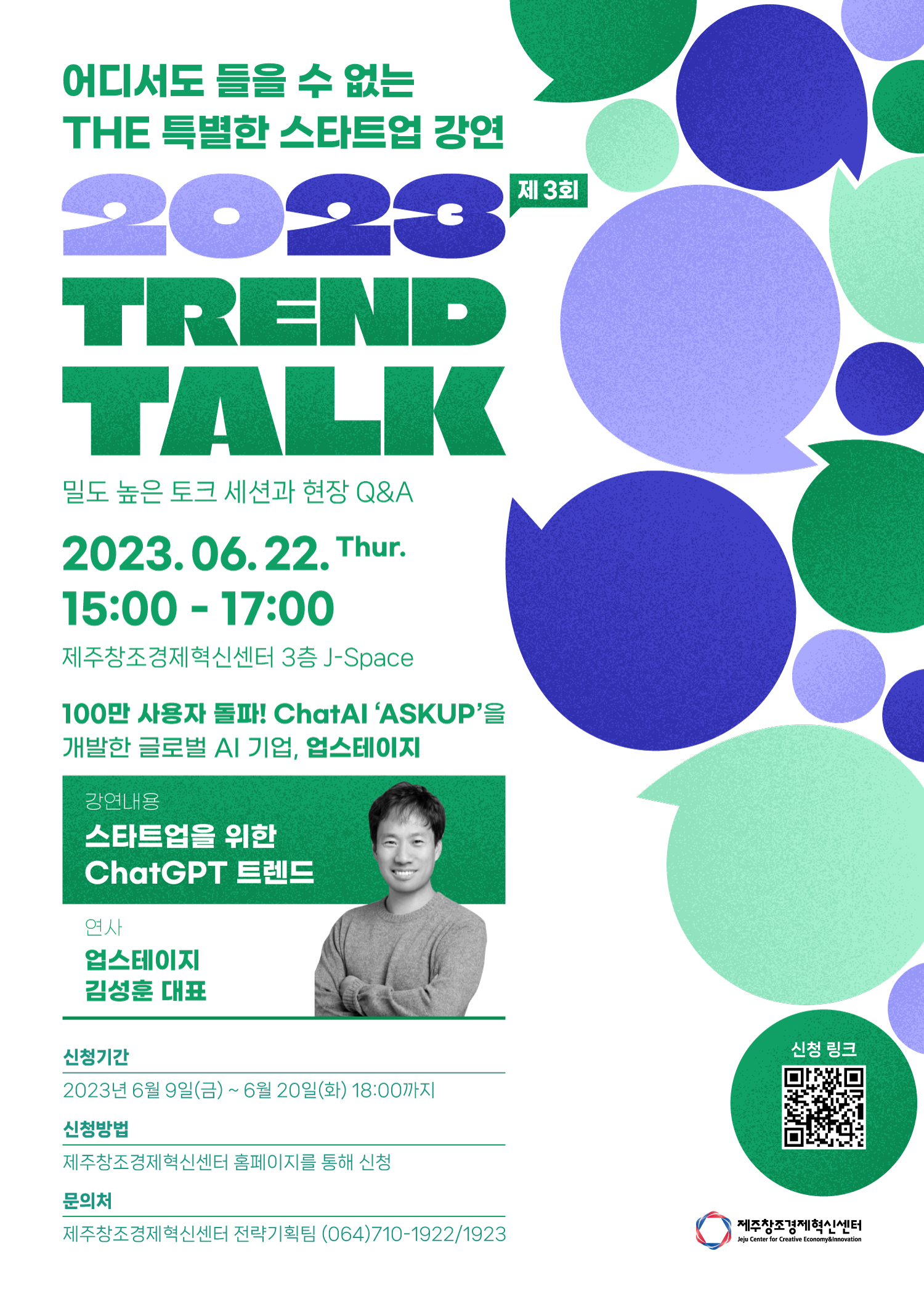 제주센터는 이번 3회차 트렌드 토크(Trend Talk)는 AI 혁명 중심에 있는 챗GPT를 다룬다. 업스테이지 김성훈 대표가 주요 강연자로 나서 ‘Falling in love with ChatGPT’를 주제로 오는 22일 오후 3시부터 제주벤처마루 3층 J-Space에서 강연을 펼칠 예정이다. 오는 20일까지 ’스타트업을 위한 ChatGPT 트렌드’를 주제로 개최되는 ‘제3회 TREND TALK(이하 트렌드 토크)’ 참가자를 모집한다.
