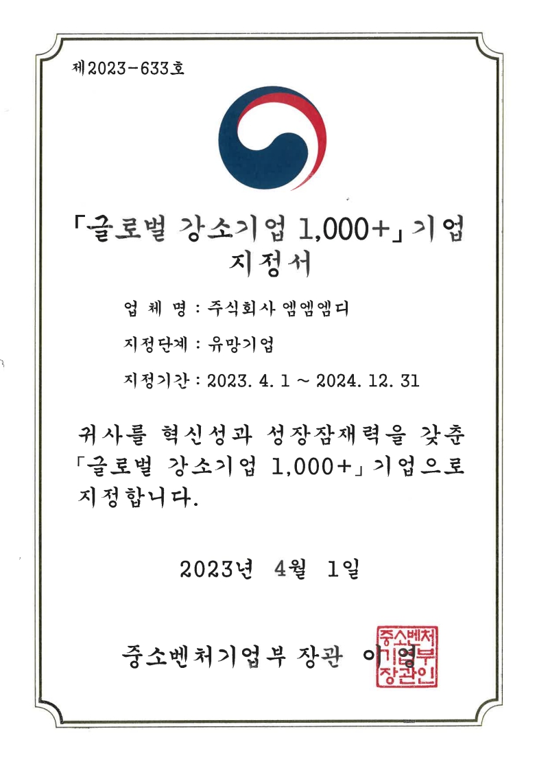 유망기업으로 지정된 엠엠엠디는 누적 167만 달러의 해외 수출액을 기록 중이다. 엠엠엠디는 퍼스널컬러 스킨브라, 릴리즈 브라렛, 지구팬티 등 신제품을 지속해서 선보이며, 해외 시장 진출에 관심을 이어갔다.