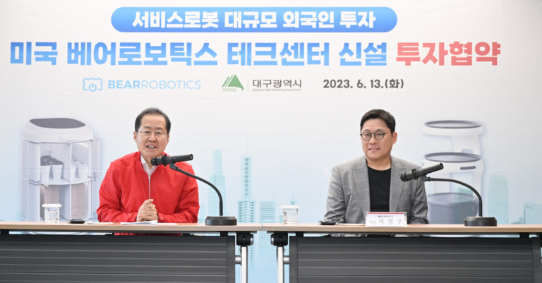 대구광역시는 13일 오후 2시 대구광역시 산격청사에서 베어로보틱스(대표 하정우)와 대구테크노폴리스 내 서비스로봇 연구 및 제조시설인 ‘베어로보틱스 테크센터’ 신설을 위한 투자 협약을 체결했다. 베어로보틱스는 구글 엔지니어 출신 하정우 대표가 2017년 설립한 세계 최초 AI기반 자율주행 서빙로봇 제조기업으로 미국 실리콘밸리에서의 연구개발을 시작으로 2020년부터 국내에서 서빙로봇 ‘서비’를 양산했다. 최근에는 소프트뱅크로부터 1천억 원 규모의 투자유치에 성공하는 등 차세대 유니콘 기업으로 주목받고 있다. 특히 베어로보틱스는 서비스로봇의 핵심기술인 자율주행기술에 탁월한 기술력을 보유하고 있어 KT, 소프트뱅크, CJ 등 국내·외 대기업 및 유명 프랜차이즈들과의 파트너십 기반 B2B 로봇 판매를 지속적으로 확장하고 있으며, 서빙로봇, 방역로봇, 층간이동로봇을 출시해 자체 개발한 플랫폼 기반으로 다양한 분야의 로봇 제품군을 확대해가며 성장하고 있다. 베어로보틱스는 연평균 20% 성장률을 보이고 있는 세계 로봇시장에서 글로벌 선도 기업으로 시장을 선점하기 위해 대구테크노폴리스 부지 22,424㎡(6,783평)에 683억 원을 투자해 글로벌 거점 역할을 할 연구 및 제조시설인 베어로보틱스 테크센터를 새롭게 건립할 계획이다. 이를 통해, 베어로보틱스는 로봇단위의 기술개발 이외에도 서비스로봇의 클라우드 기반 관제 기술과 최신 인공지능 기술을 기반으로 인공지능 모빌리티 플랫폼을 구현하는 것을 목표로 하고 있다. 베어로보틱스 테크센터가 2023년 하반기 착공에 들어가 2024년 말부터 가동되면, 대구에서 신제품 개발, 자동화된 품질 테스트, 신품화 및 고도화된 인공지능 플랫폼 기술개발 등을 진행할 예정이다. 한편 대구광역시는 로봇산업을 미래 50년을 이끌 5대 신산업으로 선정, 지역의 풍부한 로봇 인프라와 로봇산업 육성정책을 통해 최근 급성장하고 있는 서비스로봇산업 육성을 본격 추진하고 있다. ▲서비스로봇 완제품 개발·제작 ▲도심 전역 서비스로봇 실증·보급 ▲로봇 벤처·스타트업 육성 등으로 서비스로봇 전주기 지원을 추진하고 있다. 올 8월 국가로봇테스트필드 예비타당성 조사가 완료되면 국가로봇테스트필드를 중심으로 체계적인 지원을 통해 서비스로봇 분야 대표기업인 베어로보틱스와 시너지 효과가 기대된다. 또한 이미 우수한 제조업 역량과 철도 및 고속도로 등 발달된 물류 인프라를 보유한 대구-경북 지역에 2028년 TK신공항이 개항되면 국내 전역은 물론 해외로까지 연결된 세계적인 로봇제조산업 기지로 발돋움할 것으로 기대하고 있다. 관련 기사 더 보기 https://www.venturesquare.net/856803