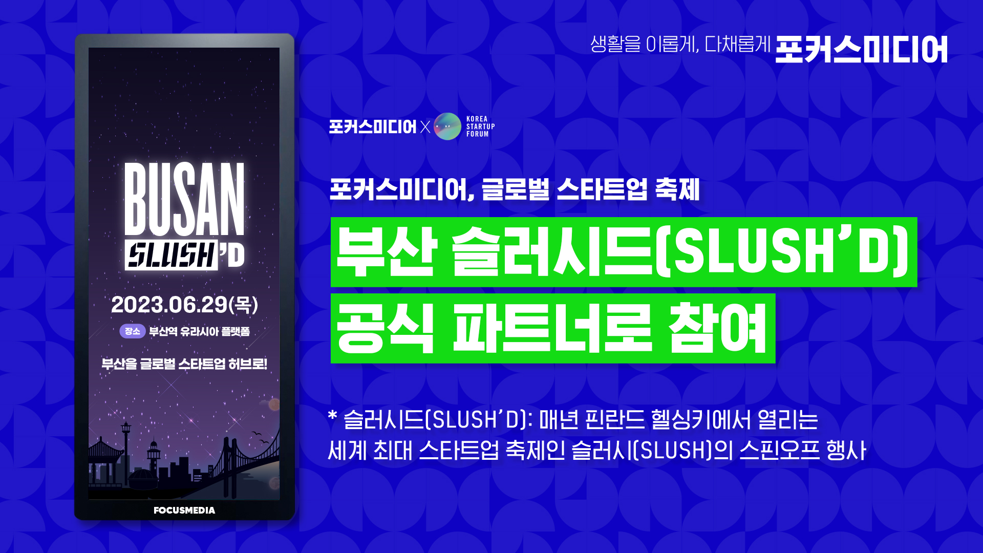 엘리베이터TV 기업 포커스미디어코리아가 매년 핀란드 헬싱키에서 열리는 세계 최대 스타트업 축제 ‘슬러시(SLUSH)’의 스핀오프 행사인 ‘부산 슬러시드(SLUSH’D)’ 공식 스폰서 파트너사로 참여한다.