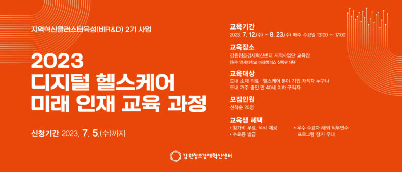 강원창조경제혁신센터(센터장 이기대, 이하 강원혁신센터)는 오는 7월 5일까지 ‘디지털 헬스케어 미래인재 교육과정’에 참여할 교육생을 모집한다.