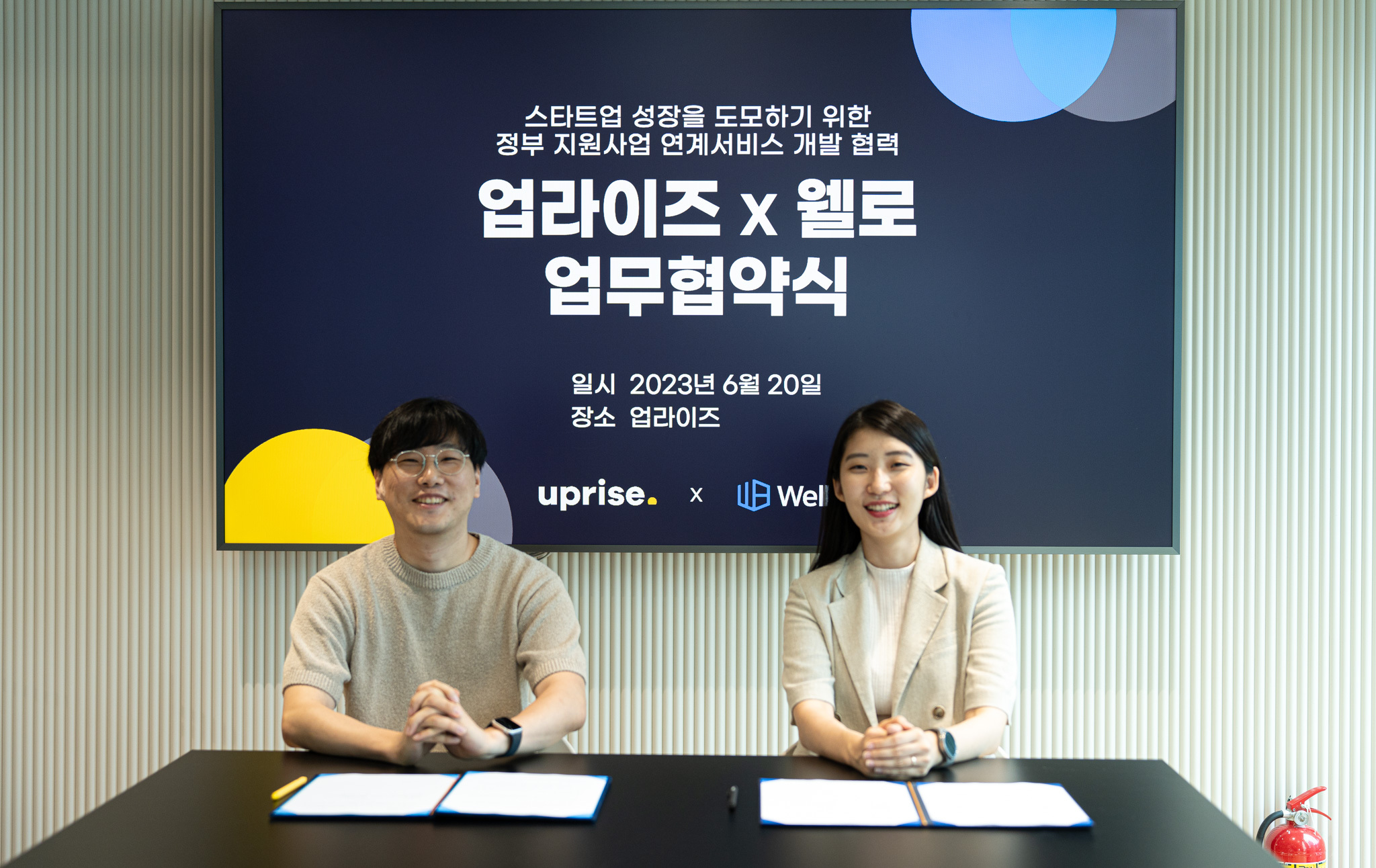 로보어드바이저 기업 ‘업라이즈’가 정부 사업 협업 관리 솔루션 웰로비즈를 서비스하는 ‘웰로’와 사업제휴 협약(MOU)을 체결했다. 양사는 스타트업 성장을 위한 정부지원사업 연계 서비스 개발협력에 나선다.