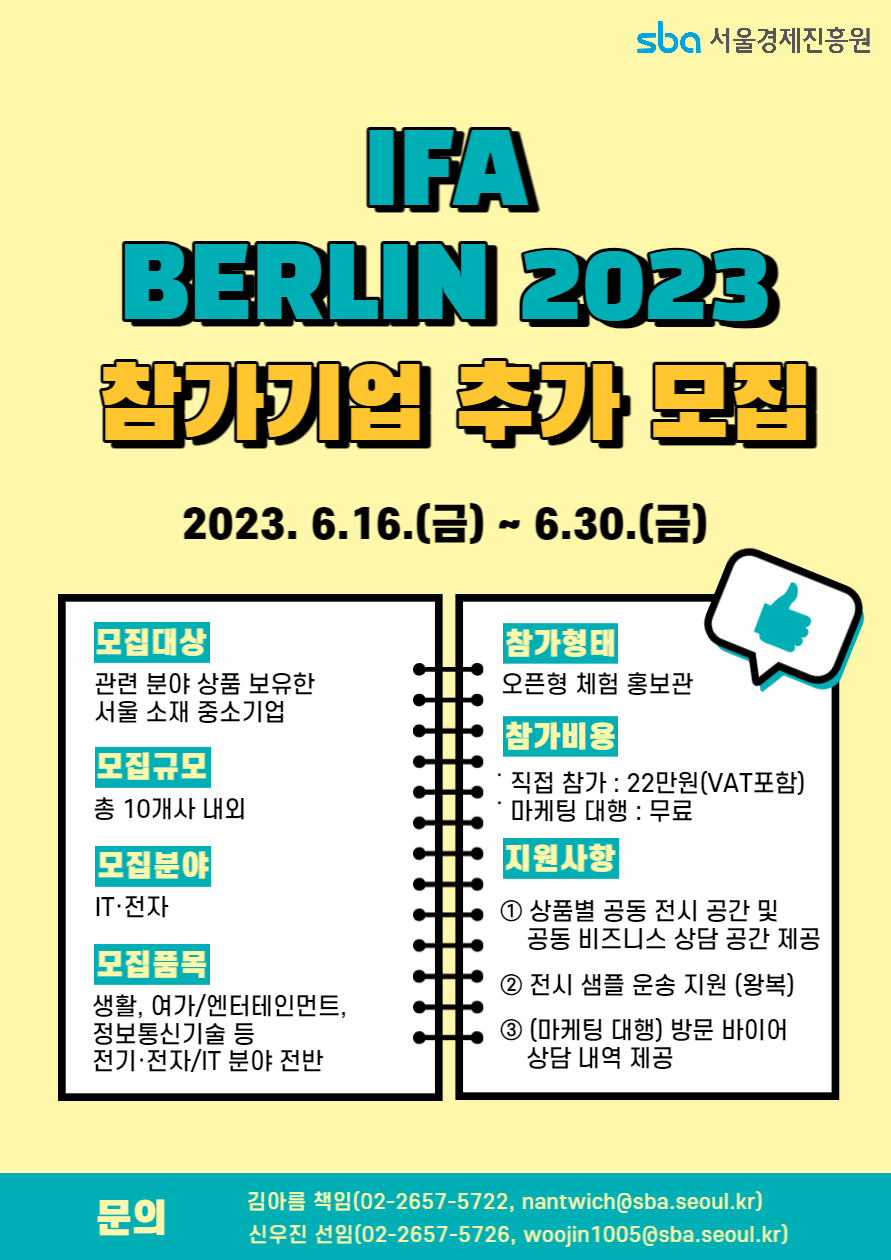 서울시 중소기업의 해외 진출 및 수출 활성화를 지원하는 중소기업 지원기관 서울경제진흥원(舊 서울산업진흥원, SBA)이 6월 30일까지 ‘베를린 국제 가전 박람회(IFA)’에 참가할 기업을 추가 모집한다.