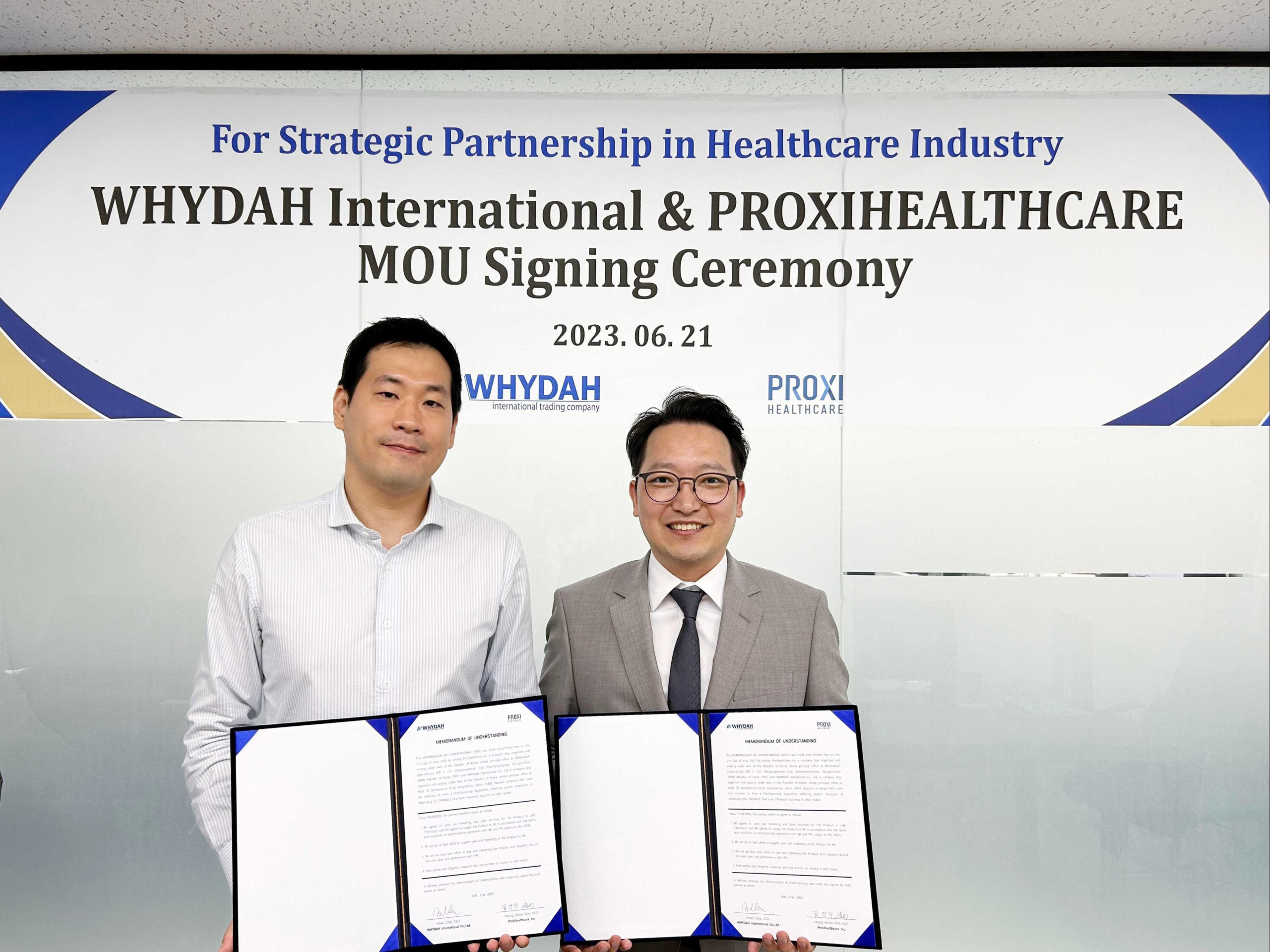 프록시헬스케어가 와이다인터네셔널과 UAE 수출 확대 및 판매촉진을 위한 업무협약(MOU)을 체결했다. 이번 MOU를 통해 프록시헬스케어는 아랍 현지에서의 입지를 다지고, 중동시장의 판매를 가속화하기 위하여 상호협력하기로 했다.