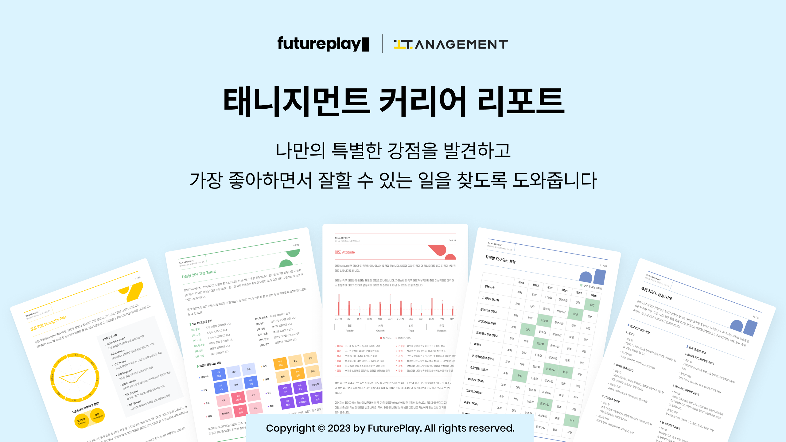 퓨처플레이는 긍정 심리학을 기반으로 개인의 강점 진단을 통해 기업의 팀 빌딩, 커리어 개발 등에 활용할 수 있는 진단 도구 ‘태니지먼트’를 운영 중이다. 태니지먼트는 적성·재능(Talent)을 관리·경영(Management)한다는 뜻의 합성어로, 개인의 재능과 잠재력을 바탕으로 회사가 효과적으로 직무 배치를 할 수 있도록 돕는다.