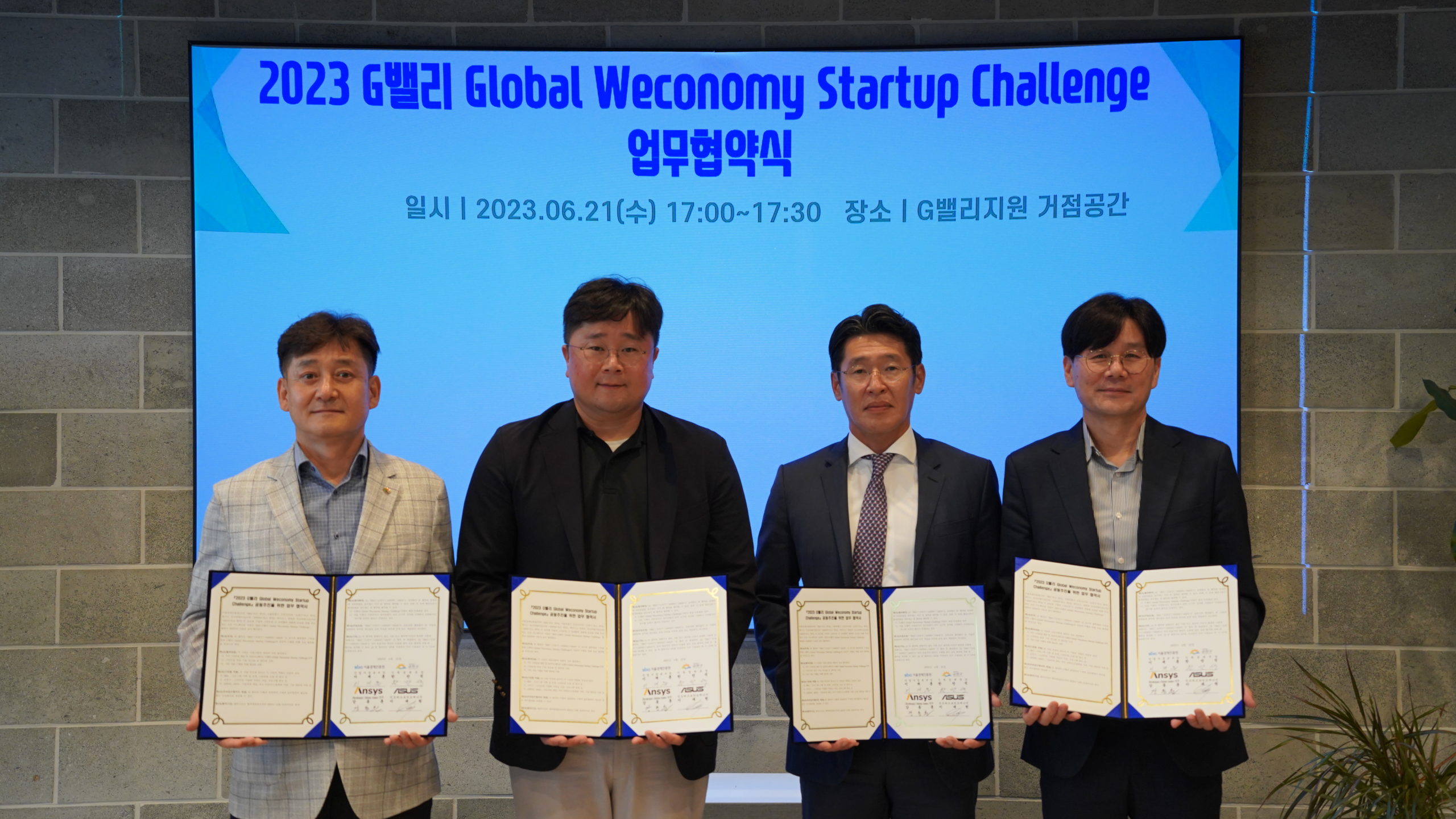 서울시의 거점별 경쟁력을 만드는 중소기업 지원기관 서울경제진흥원(舊 서울산업진흥원, SBA)이 지난 21일 금천구 가산동 소재 G밸리지원 거점공간(서울시 금천구 대륭포스트타워 5차)에서 금천구청, Ansys, ASUS와 함께 ‘G밸리 Global Weconomy Startup Challenge’ 추진을 위한 협악을 체결했다.