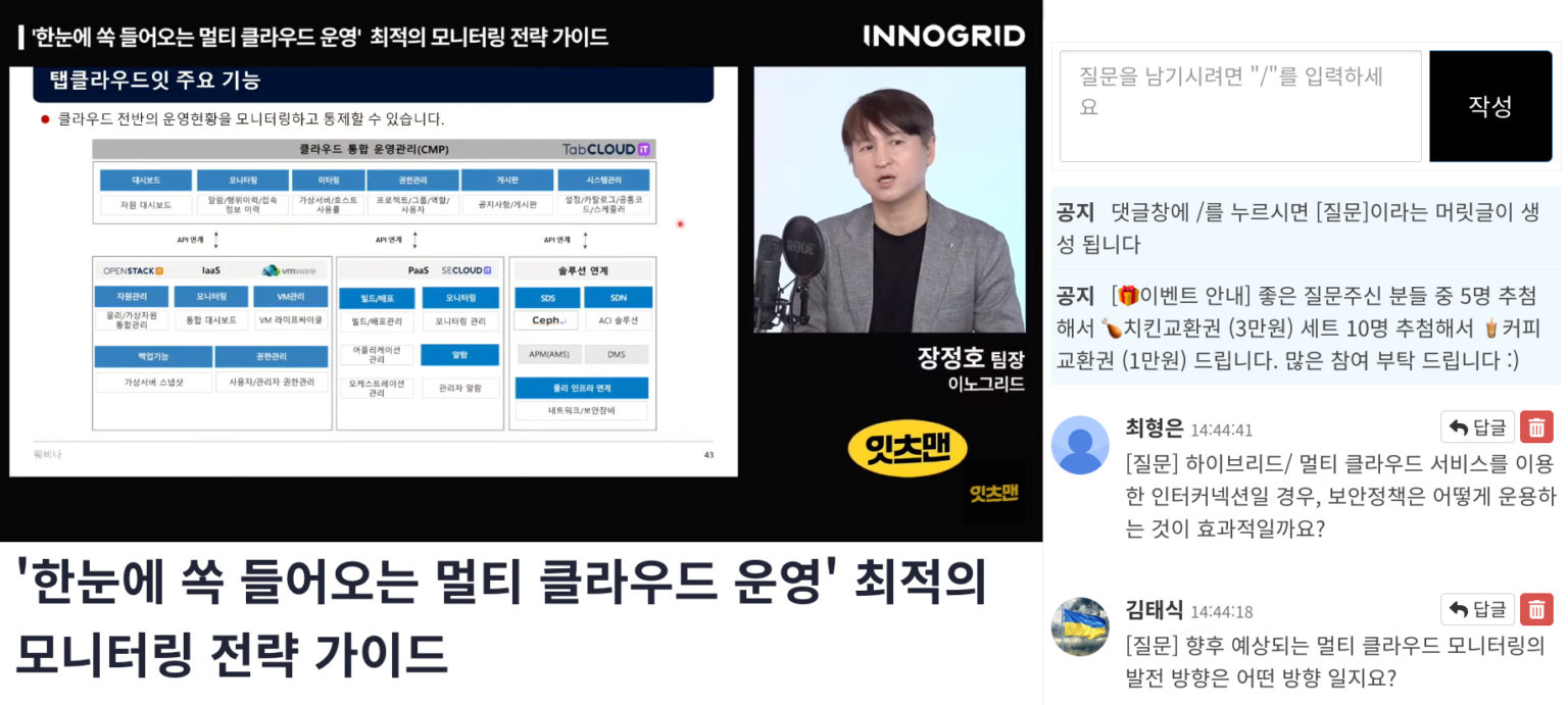 클라우드 컴퓨팅 및 디지털전환(DT) 전문 기업 이노그리드가 지난 29일 ‘멀티 하이브리드 클라우드 환경에서 성공을 위한 모니터링 전략과 고려사항’을 주제로 한 웨비나를 성공적으로 개최했다. 최근 인공지능(AI), 메타버스, 자율주행 등 4차 산업의 발전과 함께 디지털 전환이 본격화되면서 클라우드의 중요성이 강조되고 있지만, 클라우드 환경이 복잡해지고 이를 다룰 수 있는 전문 인력의 부족으로 많은 기업들이 클라우드 운영의 어려움에 직면하고 있다. 이에 이노그리드는 전략적인 모니터링을 통한 효율적인 클라우드 운영 방법에 대해 소개하고자 이번 웨비나를 준비하게 됐다. 웨비나는 멀티 클라우드 운영에 어려움을 겪고 있거나 관심이 있는 IT 담당자들에게 실질적인 도움이 될 수 있도록 이노그리드의 실제 사례와 최신 동향을 바탕으로 진행됐다. 발표는 이노그리드 CMP솔루션팀 장정호 팀장이 맡아 1시간가량 진행했다. 장정호 팀장은 먼저 ▲멀티 클라우드 ▲하이브리드 클라우드 ▲멀티 하이브리드 클라우드 등 다양한 클라우드 환경을 소개하며, 기존 단일 클라우드의 한계로 인해 소규모 데이터 센터와 클라우드를 복합적으로 운영하는 ‘멀티 하이브리드 클라우드’가 최근 국내외에서 대세로 떠오르고 있는 현황을 구체적인 데이터와 함께 살펴봤다. 다만 멀티 하이브리드 클라우드는 통합 운영이 까다로워 전문 인력을 구하기 힘들고, 장애 발생 시 신속한 대응이 어려우며, 자원과 비용의 최적화가 쉽지 않다고 지적했다. 때문에 멀티 하이브리드 클라우드의 성능, 가용성, 비용, 보안, 자원 등을 모니터링해 문제점을 신속히 파악하고, 서비스 품질을 유지하는 한편, 비용을 효율적으로 관리하는 전략을 세워야 한다고 말했다. 이때 통합 모니터링을 통해 이상 징후를 탐지하고 자동화 기능으로 자원 최적화를 돕는 중앙통합 관제시스템이 필요하며, IaaS와 PaaS의 계층이 다른 경우 복잡한 장애 현상이 발생하는 만큼 장애 원인을 종합적이고 빠르게 확인 및 분석할 수 있는 시스템이 필요하다고 강조했다. 특히 이를 손쉽게 실현하는 방안으로 이노그리드의 유형별 클라우드 솔루션을 제시했다. 장 팀장은 멀티&하이브리드 전문 기업으로서 이노그리드가 보유한 CMP 솔루션 ‘탭클라우드잇’, PaaS 솔루션 ‘SE클라우드잇’, IaaS 솔루션 ‘클라우드잇’과 ‘오픈스택잇’ 등 클라우드 풀스택을 소개하며, 각 제품에 적용된 기술을 활용하면 대용량 클라우드 시스템을 효과적으로 모니터링하고 관리할 수 있다고 설명했다. 이와 함께 실제 공공기관과 금융그룹 등에 적용된 탭클라우드잇의 사례를 소개하고 우수한 기술력을 바탕으로 안정성과 보안성을 입증받은 해당 솔루션들이 모니터링 전략의 대안이 될 수 있다고 강조했다. 이노그리드 장정호 팀장은 “갈수록 클라우드 의존도가 증가하는 만큼 가상자원을 관리하는 데 들어가는 시간과 노력을 줄일 수 있도록 모니터링 전략부터 고민하는 것이 매우 중요하다”며 “클라우드를 이용 중이거나 클라우드를 활용한 디지털 전환을 고민하고 있는 기업 내 IT 담당자들에게 이번 강의가 도움이 되었길 바란다”고 말했다. 관련 기사 더보기 https://www.venturesquare.net/885579