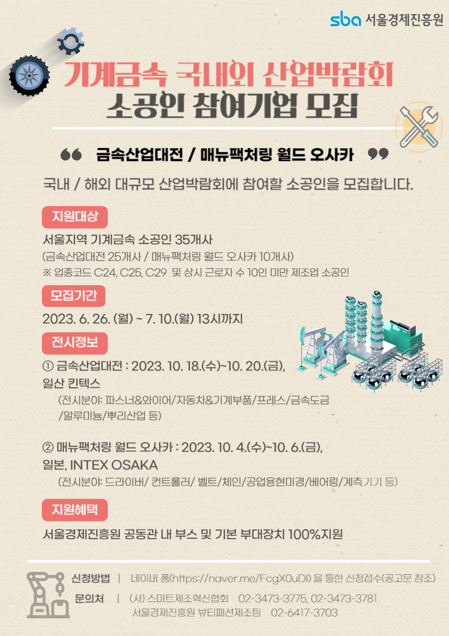 서울경제진흥원(舊 서울산업진흥원, SBA)이 7월 10일 13시까지 2023년도 약자동행을 위한 기계금속 소공인 대상 ‘금속산업대전’ 및 ‘매뉴팩처링 월드 오사카’ 박람회 참가지원 사업에 참여할 기업을 모집한다.