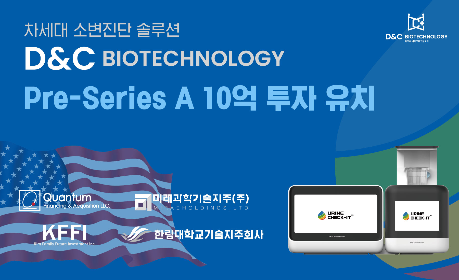 차세대 소변진단 솔루션을 개발하는 디앤씨바이오테크놀로지가 10억원 규모의 프리 시리즈 A 투자 유치를 성공적으로 완료했다. 이번 투자 라운드는 미국(USA) 투자사인 Quantum F&A LLC, KFFI 와 한림대학교기술지주가 신규 참여하고 기존 투자자인 미래과학기술지주가 후속 참여했다.