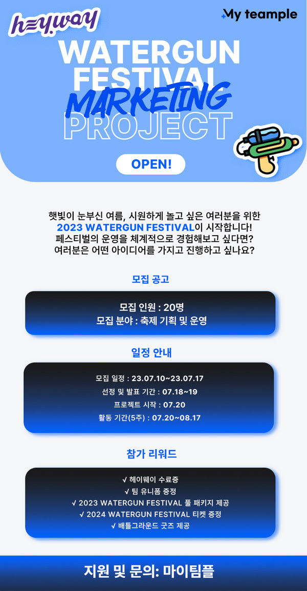 마이팀플 운영사 프로젝트퀘스천 최은원 대표는 “성공적인 브랜딩과 도심형 콘텐츠로 주목받고 있는 물총축제와 함께 직무경험 프로그램을 오픈하게 됐다”며 “실질적인 직무경험을 요하는 공연/행사업계에 취업하고자 하는 청년들의 많은 참여와 관심 부탁한다”고 말했다.