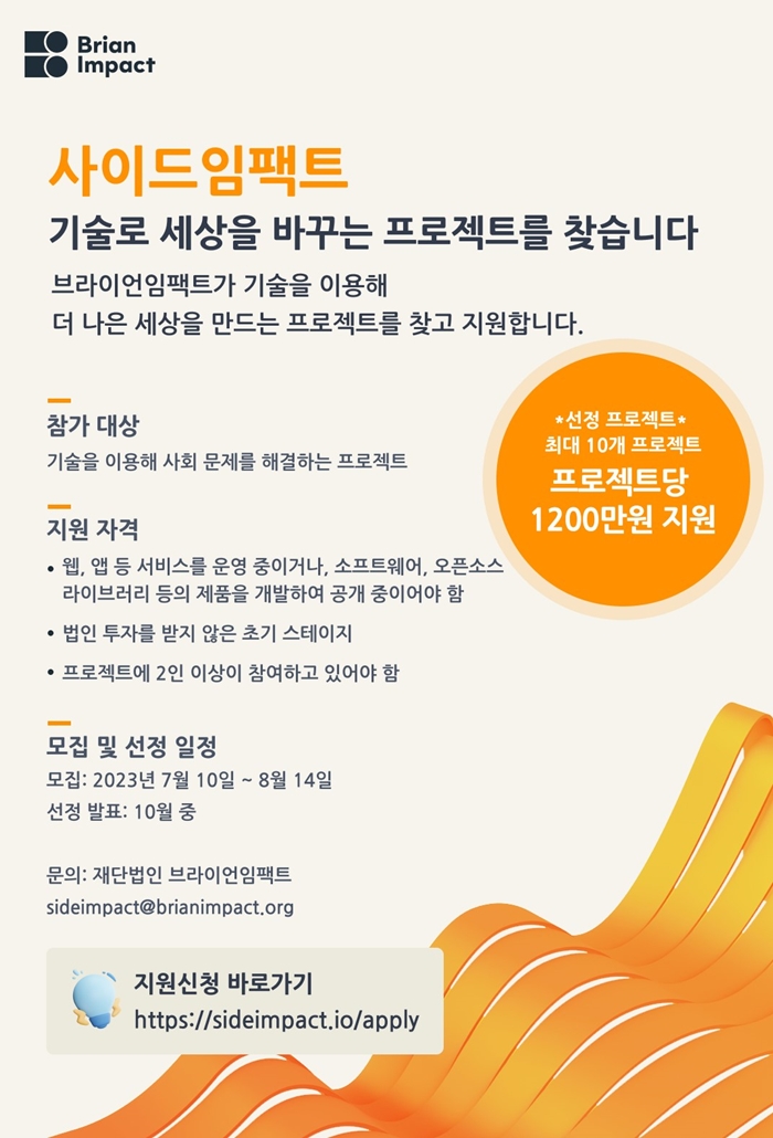 재단법인 브라이언임팩트(이사장 김정호)는 기술로 더 나은 세상을 만드는 프로젝트 지원 공모인 ‘사이드임팩트’ 베타라운드 지원자 공개 모집을 시작했다고 11일 밝혔다.