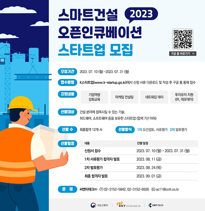 스타트업 투자 전문 액셀러레이터 씨엔티테크㈜(대표 전화성, CNTTECH)가 ‘2023 스마트건설 오픈 인큐베이션’에 참가할 스타트업을 지난 10일부터 오는 31일까지 모집한다.
