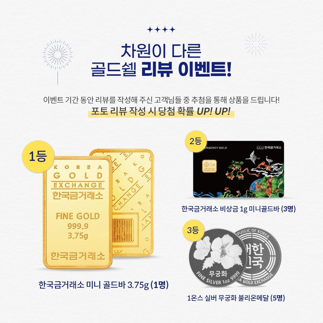 금반지나 금목걸이 등 순금 제품 구매 고객이 리뷰를 작성하면, 추첨을 통해 1등 1명에게 3.75g 미니골드바를, 2등 3명에게 비상금 1g을, 3등 5명에게 1oz 불리온메달을 증정한다. ‘리뷰 쓰고 순금 받고’ 이벤트는 오는 8월 10일까지 진행되며, 당첨자는 8월 14일 발표 예정이다.