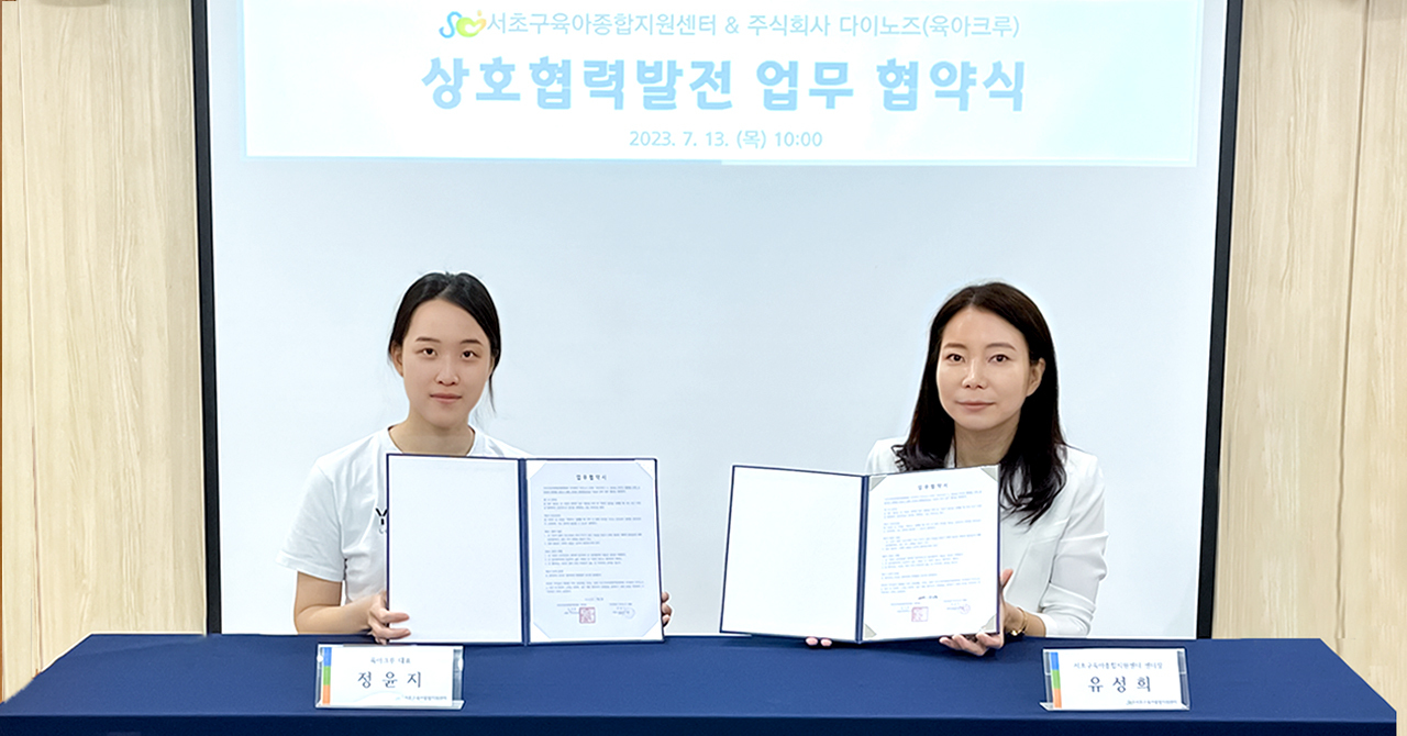 모바일앱 ‘육아크루’를 운영하는 주식회사 다이노즈가 지난 7월 13일 서초구육아종합지원센터와 서초구 내 공동육아 문화를 위한 업무협약(MOU)을 체결했다. 양사는 이번 협약을 통해 출산과 육아에 대한 인식을 개선하고, 서초구에 거주하는 육아 가정을 위해 다양한 프로그램을 함께 기획할 예정이다.