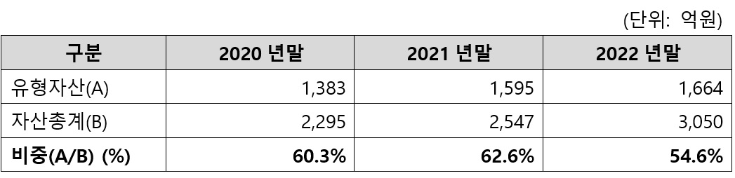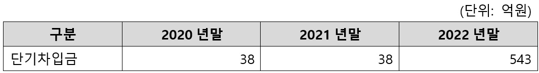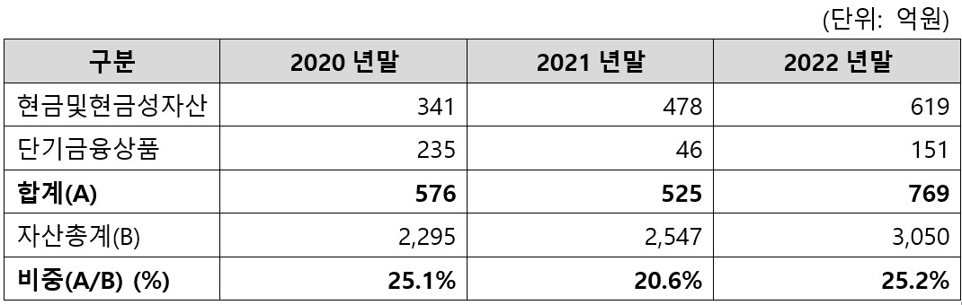 비교적 단기간에 현금화할 수 있는 현금및현금성자산, 단기금융상품이 전체 자산에서 큰 비중을 차지하고 있습니다. 특히 가장 최근기간인 2022년말 기준 현금보유량이 크게 증가하였는데, 이는 후술할 금융기관 차입액 500억원 발생에 기인합니다.