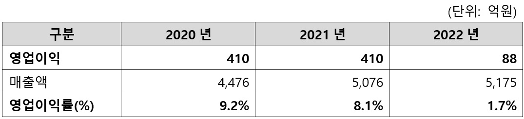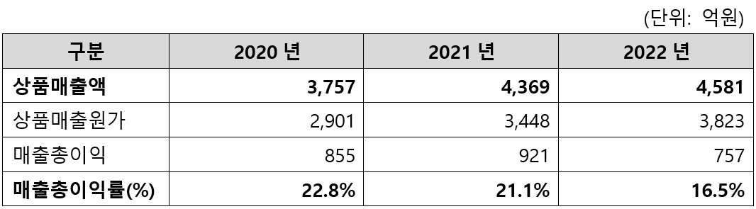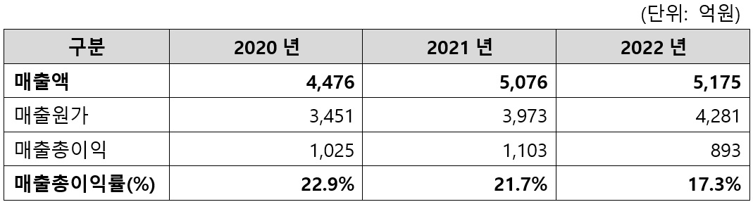 2022년 매출액은 5,175억원이며, 대부분 가맹점주에게 치킨 재료등의 상품을 판매하는 상품매출로 구성되어 있습니다. 매출액은 과거기간부터 소폭 증가하는 추세이나, 매출원가가 크게 증가하여 매출총이익은 오히려 감소하였으며, 그 수익성 또한 크게 악화되었습니다.