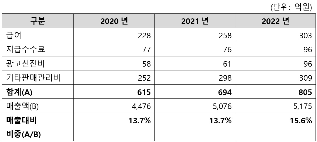 2022년 판매관리비는 805억원으로, 지난해 대비 100억원 이상 증가했습니다. 판매관리비의 주요 증가 원인은 급여(인건비)비용의 증가, 지급수수료 및 광고선전비 증가에 기인하며, 매출액 대비 비중 또한 약 2% 수준 증가하였습니다. 상기에서 언급한 매출원가율의 증가, 그리고 판매관리비 증가로 인해 교촌에프앤비의 영업이익은 88억원으로 지난해(410억원) 대비 큰 규모로 감소하였으며, 수익성 또한 크게 악화되었습니다.