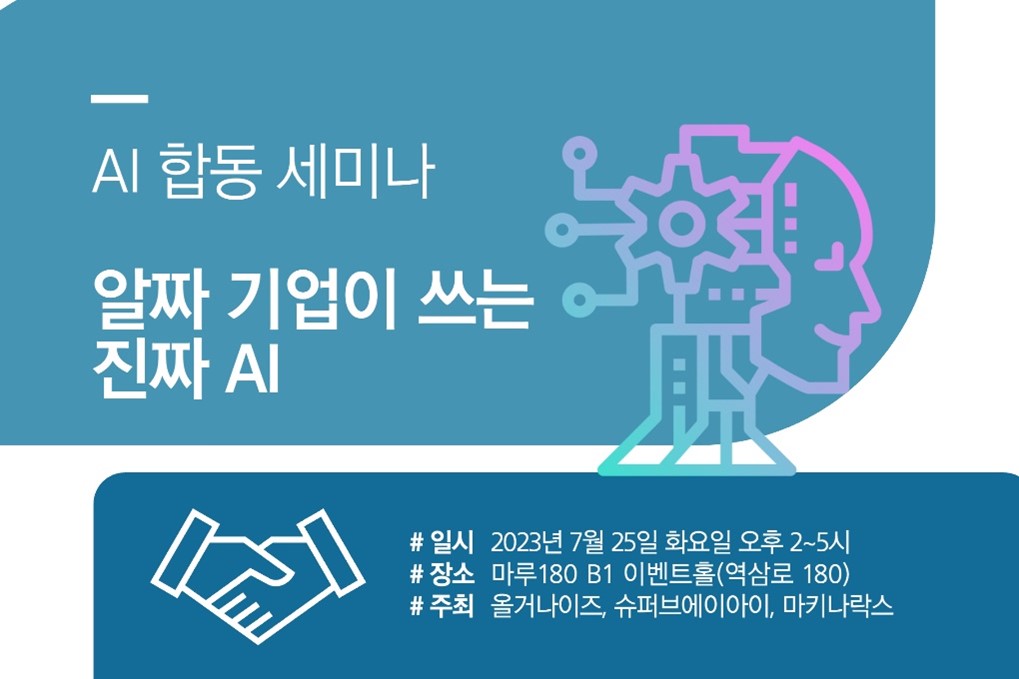 자연어 인지검색 솔루션 기업 올거나이즈가 슈퍼브에이아이, 마키나락스와 함께 ‘알짜 기업이 쓰는 진짜 AI 도입·활용 사례’를 주제로 25일 세미나를 개최한다.