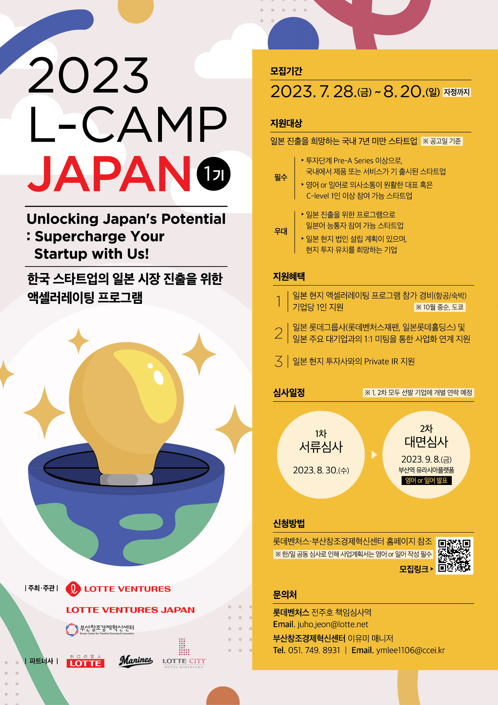 롯데벤처스가 롯데벤처스재팬, 일본 롯데홀딩스, 부산창조경제혁신센터와 함께 일본 시장 진출을 희망하는 한국의 스타트업을 대상으로 오는 8월 20일까지 ‘2023 L-CAMP JAPAN 1기 프로그램’ 참여기업을 모집한다.