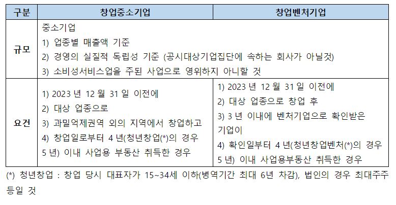 하지만 소득과 관계없이 부동산을 취득하거나 보유할 때 납부하여야 하는 취득세, 재산세에 대해서도 창업중소기업이 받을 수 있는 세제혜택이 있다. 바로 지방세특례제한법 제58조의 3에 따른 창업중소기업 등에 대한 감면이다. 상세내용 및 요건은 다음과 같다.