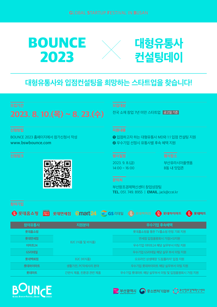 부산광역시(시장 박형준, 이하 부산시), (재)부산창조경제혁신센터(센터장 송용준, 이하 부산창경)는 글로벌 스타트업 페스티벌 ‘BOUNCE 2023’의 밋업 존에 참가할 스타트업을 오는 23일까지 모집한다고 밝혔다.