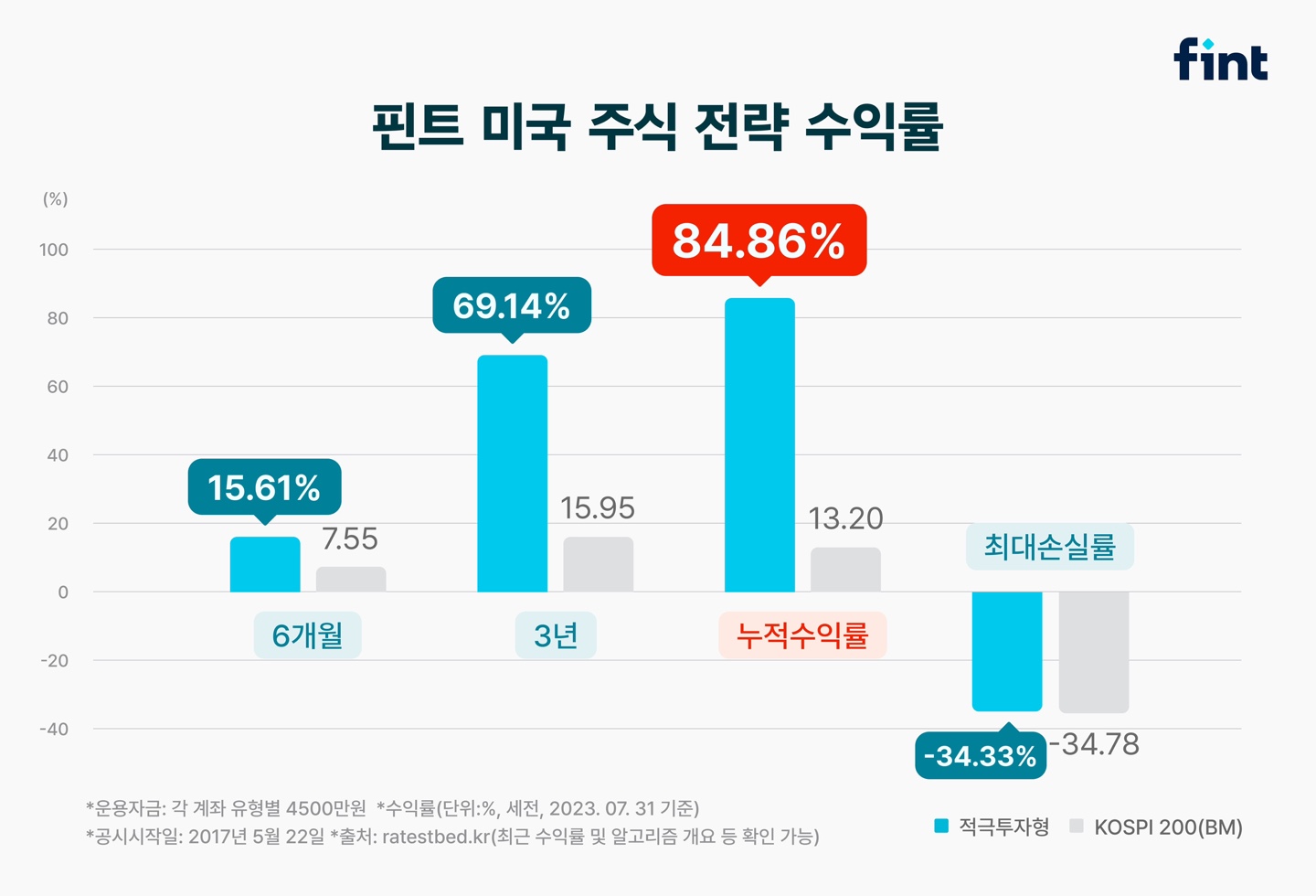 핀트의 ‘미국 주식 전략’ 투자 서비스에는 국내 최장 테스트 운용기간의 주식 전략 알고리즘이 적용됐다. 코스콤 로보어드바이저 테스트베드센터에서 2017년 5월부터 운용을 시작해, 현재 운용 중인 주식 전략 알고리즘들 가운데 최장 기간 운용 중이며, 지난 6년 간의 테스트베드를 통해 뛰어난 성과와 안정성을 입증받았다.