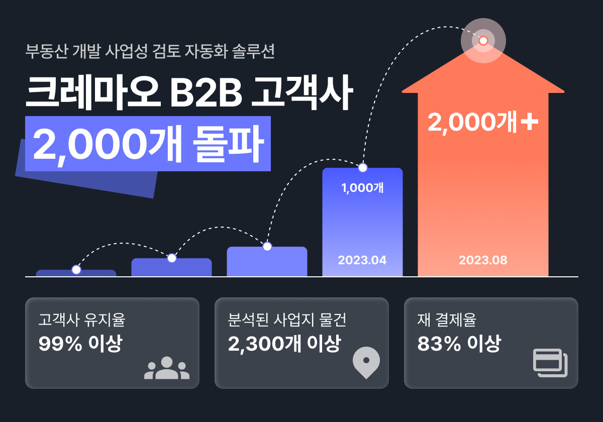 크레마오 담당자 박철영 팀장은 “고객사 1천개를 돌파한 후, 불과 4개월만에 2배의 성장을 보이며 부동산 시장 내에서의 니즈가 계속 확대되고 있음을 확인했다. 앞으로도 다양한 데이터를 추가하여 업무 효율을 더욱 높이는 솔루션으로 성장하겠다”고 소감을 말했다.