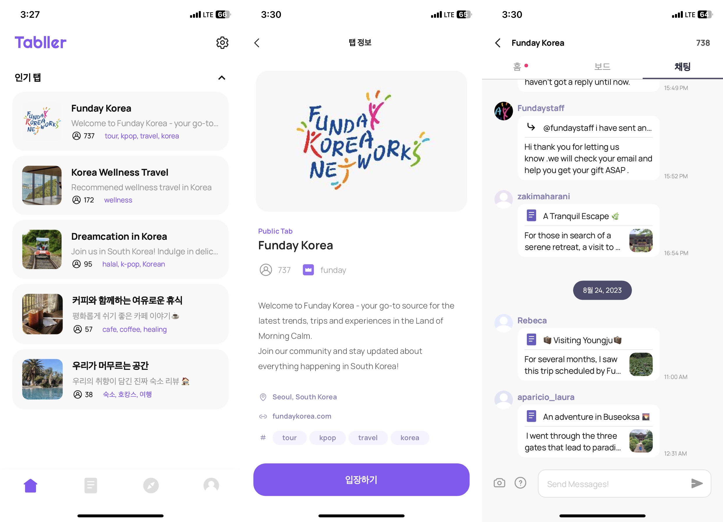 “여행업계에서 공급자와 수요자 간의 여행 정보 비대칭을 해결하는 플랫폼이 되고 싶습니다. 여행사뿐 아니라, 여행 크리에이터 등 많은 여행 공급자가 있어요. 다양한 여행 공급자들과 여행자들 간의 직거래도 기능하죠. 여행자들은 광고가 아닌 진짜 정보를 만날 수 있고 공급자들은 안정적으로 수익을 창출할 수 있는 직거래 플랫폼이 될 거에요.” 태블러 안에서 수요자와 공급자가 자유롭게 오픈그룹채팅을 하며 여행정보를 주고받을 수 있다. 어플리케이션은 구글 스토어 또는 애플 스토어에서 다운받을 수 있으며 국문과 영문으로 제공된다.