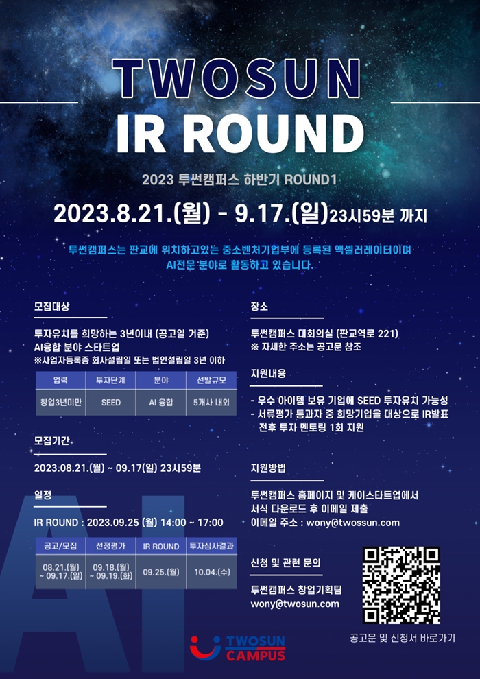 ‘TWOSUN IR ROUND’는 AI분야 투자를 적극 유치하기 위해 투썬캠퍼스에서 새롭게 런칭한 데모데이 이다. 본 행사는 분기별 1회씩 진행할 예정이며, 하반기에는 오는 9월과 12월에 진행 할 예정이다. 실질적으로 우수한 AI스타트업이 발굴되면 투자에 대한 검토를 진행하여 직접투자까지 진행되는 원스톱 프로그램이다. IR은 프라이빗으로 진행되며, 투썬캠퍼스의 심사역들이 스타트업을 만날 예정이다.