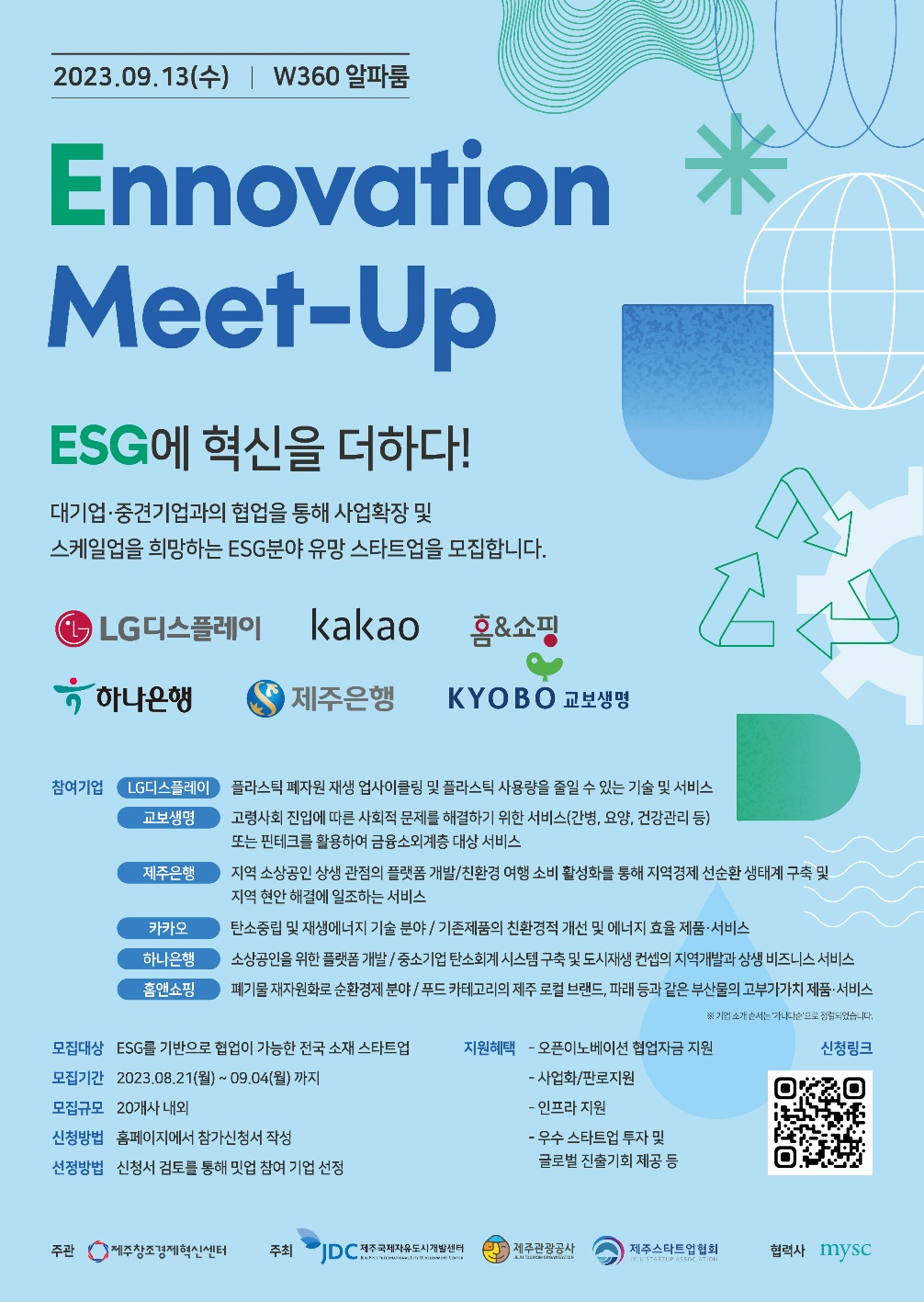 제주창조경제혁신센터(이하 제주센터)가 제주국제자유도시개발센터, 제주관광공사, 제주스타트업협회와 공동주최로 내달 4일까지 ESG 오픈이노베이션 프로그램을 주관하면서 참가할 스타트업 20개사를 모집한다.