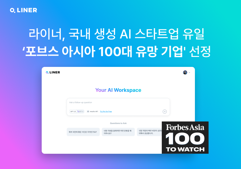초개인화 생성 AI 스타트업 ‘라이너(LINER)’가 경제 매거진 포브스가 발표한 ‘아시아 100대 유망기업(Forbes Asia 100 To Watch 2023)’ 선정됐다.