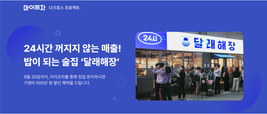 마이프랜차이즈 김준용 대표는 “마이프차는 매월 30만명이 넘는 순방문자수를 기록하며 프랜차이즈 창업 1등 버티컬 플랫폼으로 성장했다”라며 “달래해장과 같이 빠르게 성장하고 있는 유망 브랜드를 예비창업자와 가장 빠르게 연결해줄 수 있도록 다크호스 프로젝트에 어울리는 브랜드를 적극 발굴해 나갈 계획이다”라고 말했다.