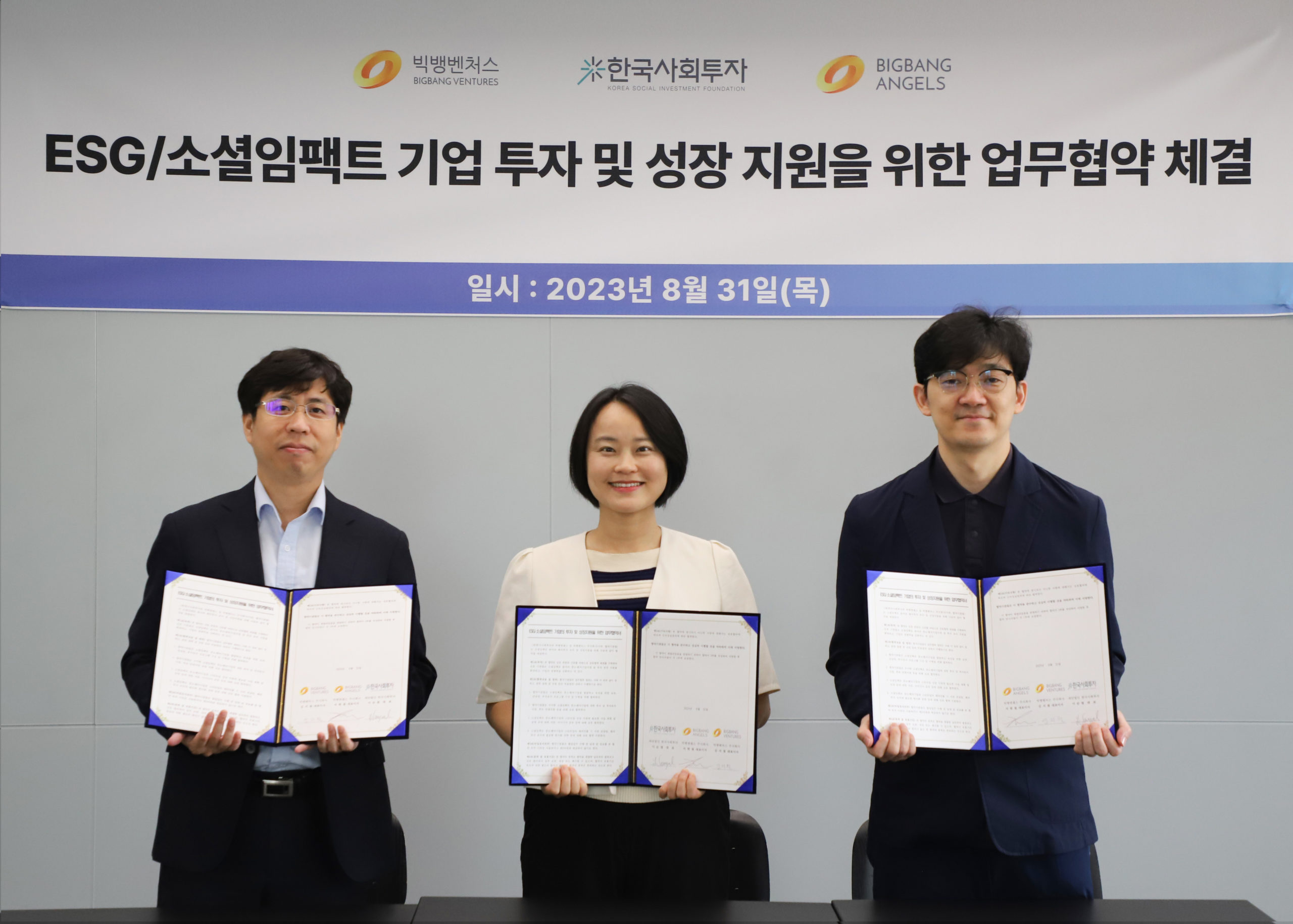 ESG/임팩트투자사 한국사회투자가 ESG 및 소셜임팩트 기업에 대한 투자와 성장 지원을 확대하기 위해 빅뱅벤처스, 빅뱅엔젤스와 업무협약(MOU)을 체결했다.