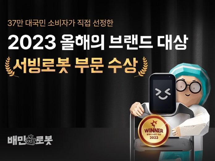 2023 올해의 브랜드 대상은 지난 7월 3일부터 16일까지 온라인 및 전화 설문을 통해 투표가 진행됐으며, 배민로봇은 새로 신설된 ‘올해의 서빙로봇’ 부문에서 약 37만명의 소비자 참여를 통해 최종 선정되었다.