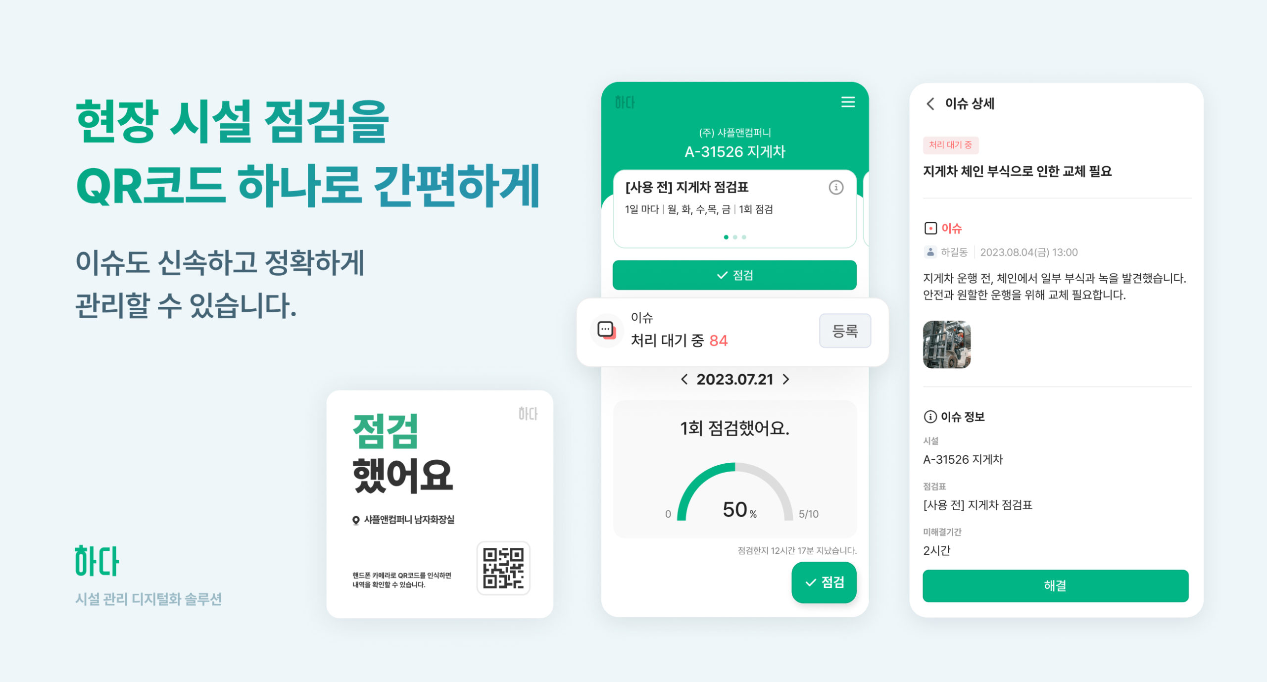 ‘하다(HADA)’는 환경 미화, 안전, 위생, 기계설비와 같은 정기적인 점검이 필요한 시설이나 장소에 QR 코드를 부착하여 정기 점검 프로세스를 디지털화하는 솔루션이다.