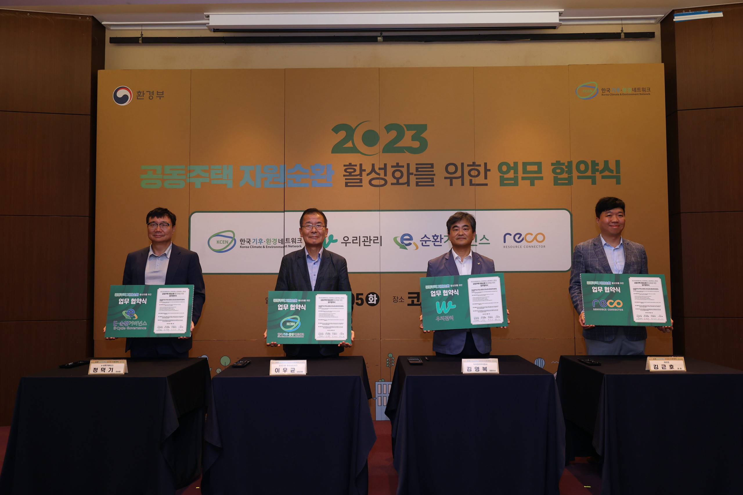 리코(Reco)가 한국기후·환경네트워크, 우리관리, E-순환거버넌스와 ‘공동주택 내 자원순환 활성화를 위한 업무협약’을 맺었다.