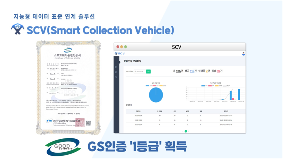 GS인증 1등급을 획득한 에이데이타의 ‘SCV(Smart Collection Vehicle)’는 API 연계 자동화를 위한 데이터 연계 기술을 바탕으로 다양한 API를 통해 필요한 데이터를 일시에 수집할 수 있도록 지원하는 솔루션이다.