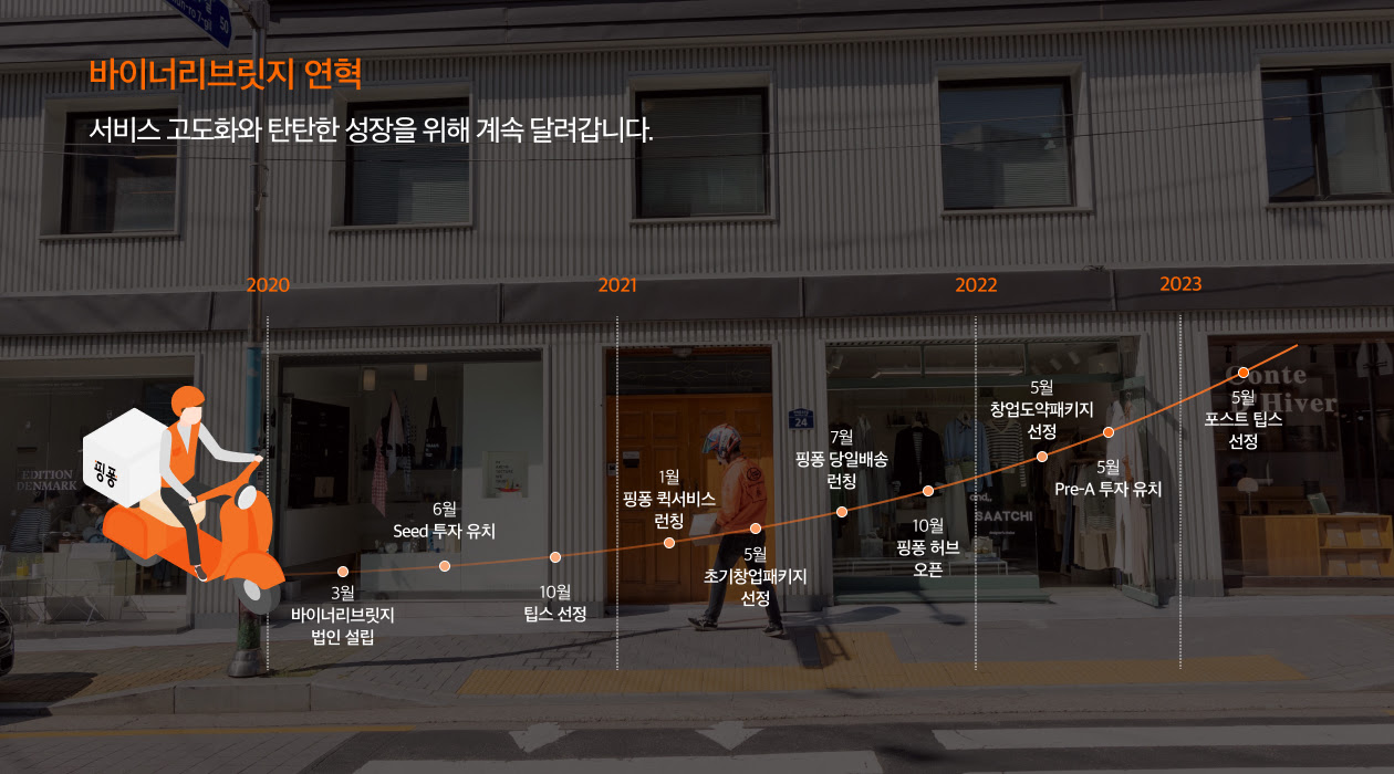 바이너리브릿지는 자체 개발한 AI 배송 최적화 솔루션을 기반으로 핑퐁 퀵서비스와 핑퐁 당일배송을 운영하고 있다. 핑퐁 퀵서비스는 개인, 기업 고객 모두 편리하게 이용할 수 있는 온라인 주문, 정산 관리 시스템과 정시 배송 서비스를 제공하고 있다. 핑퐁 당일배송은 이커머스 사업자들을 위한 라스트마일 솔루션이다. 온라인 쇼핑몰에서 낮 3시까지 완료된 주문을 평균 6시간 이내 소비자에게 배송한다.