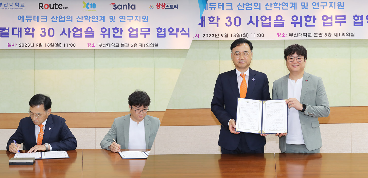디지털 기술 교육 전문 에듀테크 기업 루트가 18일 부산대학교와 에듀 테크 산업 육성을 위해 업무 협약을 체결했다.