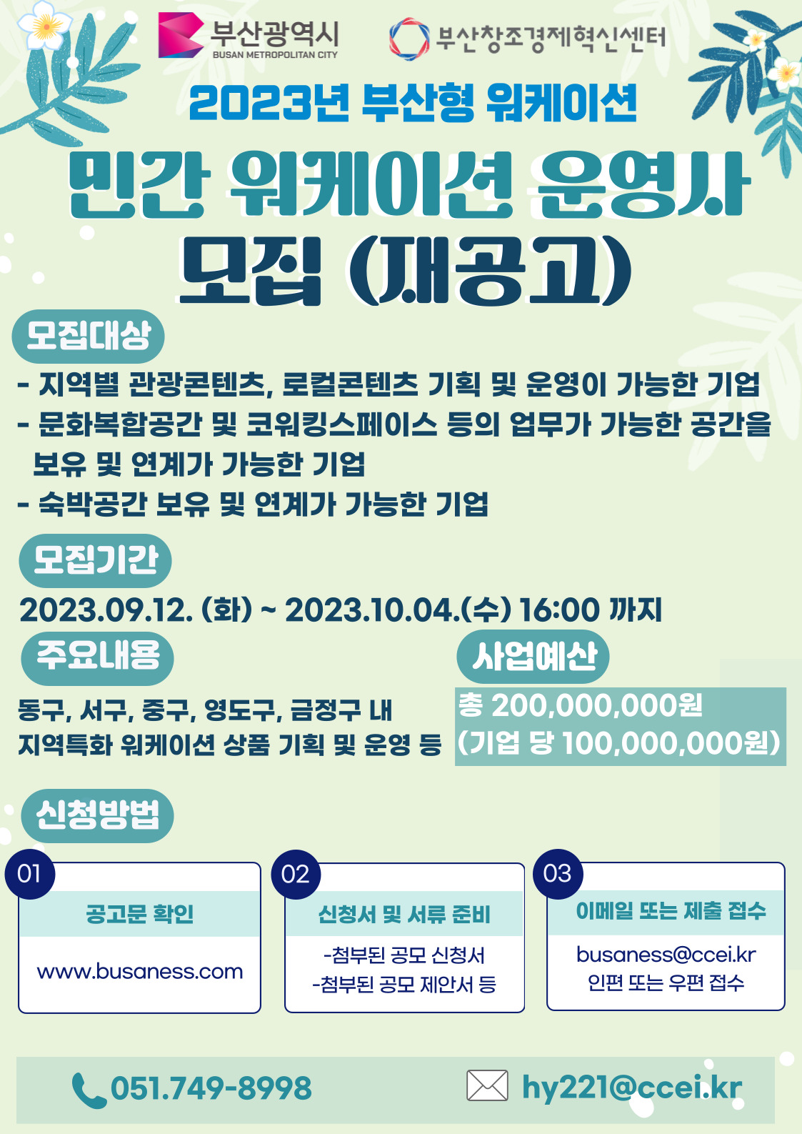 모집대상은 지역별 관광콘텐츠, 로컬콘텐츠 기획 및 운영이 가능하고, 숙박공간 보유 및 연계가 가능, 문화복합공간 및 코워킹스페이스 등의 업무가 가능한 공간을 보유 및 연계가 가능한 기업이다. 접수기간은 오는 10월 4일 오후 4시까지 이며, 이메일(busaness@ccei.kr) 및 우편접수가 가능하다.