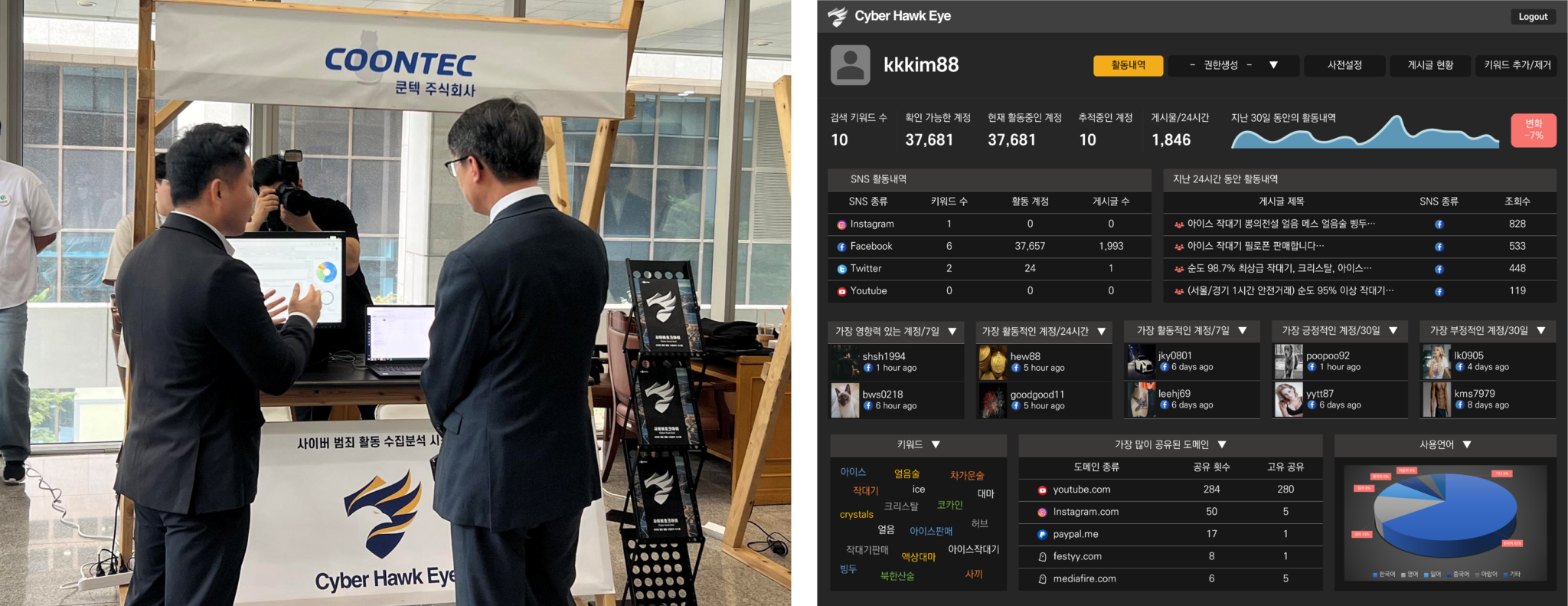 사이버위협 인텔리전스 정보 수집 전문 기업 쿤텍 주식회사가 지난 9월 21일 금융감독원이 주최한 ‘테크파인더(Tech Finder) 쇼케이스’에 참여하여 다크웹 모니터링 시스템인 ‘사이버 호크아이(Cyber Hawk Eye)’ 기술을 시연하고 적용 사례를 발표했다. 이번 ‘테크파인더 쇼케이스’는 ‘금융권의 다크웹 위협 대응’을 주제로 서울 영등포구에 위치한 금융감독원 본원에서 개최됐다. 쿤텍은 이번 쇼케이스를 통해 사이버 인텔리전스 분석 기반의 추적 시스템인 ‘사이버 호크아이(Cyber Hawk Eye)’ 기술 데모를 선보였다. 사이버 호크아이는 다양한 환경에 맞춤형 모듈식 플랫폼을 제공하여 다크웹과 딥웹에서 발생되는 개인 정보 유출 및 국방부, 행정기관, 공공기관, 민간기업 등의 ID/PW 및 도메인 정보 유출, 가상 화폐 불법 거래와 관련된 정보를 수집 및 분석하여 금융권에서 일어날 수 있는 다크웹 악용 범죄로 피해를 최소화할 수 있다. 특히 이번 행사에서 다크웹에서 유출 및 거래되고 있는 개인 신용카드 정보 수집(실시간 정보 수집 및 모니터링 보고서 제공), 개인 계정 유출 모니터링(텔레그램에서 유출 및 불법 거래되고 있는 개인 계정 모니터링 및 탐지) 등 표면웹부터 다크웹, 딥웹까지 이르는 정보 수집 및 관리의 기능을 선보였다. 쿤텍의 임정택 부장은 “쿤텍은 다양한 분야의 공공기관 및 민간기업과 협업하며 확보한 독보적인 다크웹 모니터링 기술력과 사이버 호크아이 공급을 통해 단순 데이터 수집만으로는 대응하기 어려웠던 금융권 관련 위협에 대한 신속한 지원이 가능하다”고 전했다. 관련 기사 더보기 https://www.venturesquare.net/894375