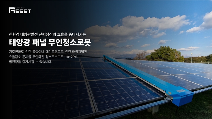 기후변화로 인한 폭설이나 대기오염으로 인해 태양광 패널의 발전수익이 최대 35%까지 감소하는 등 효율 감소 문제가 빈번히 발생하고 있다. 이러한 문제점을 극복하고자 ‘리셋컴퍼니’에서는 무인화된 청소로봇을 통해 10~20% 발전량을 증가시키는 방안을 구축하였다. ‘태양광 패널 무인 청소로봇’은 강우˙강설 센서를 통해 기후변화를 감지하고 업계 최초 무인 제설 기술 및 친환경 빗물을 활용한 세척기술을 통해 99%의 오염을 제거하는 등 높은 경쟁력을 지녔다.