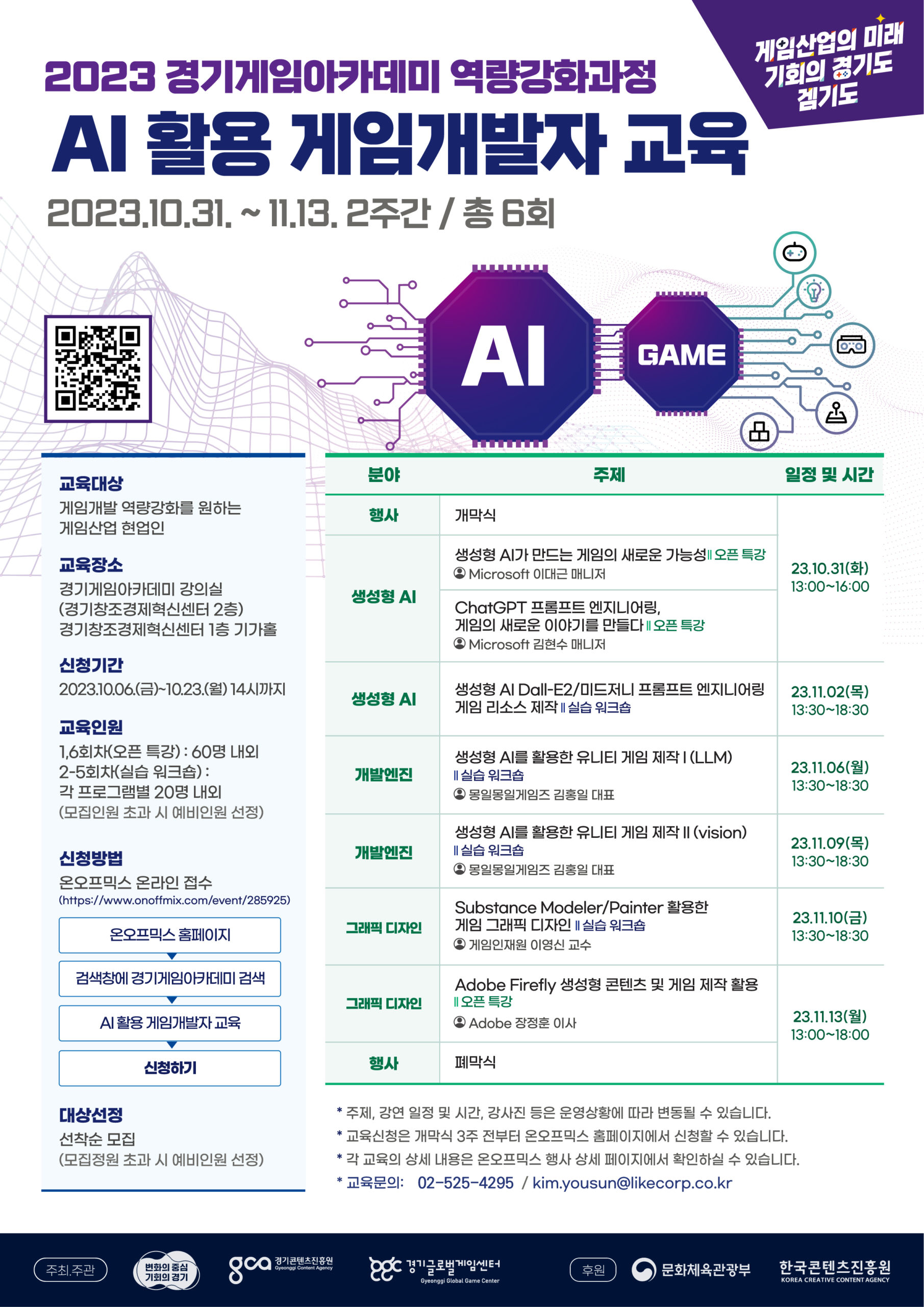 2023 역량강화과정은 게임 개발자가 AI를 활용해 개발 효율을 높여 소규모 게임사가 보다 경쟁력을 갖출 수 있도록 기획된 교육 프로그램이다. 경기도 성남시 경기글로벌게임센터에서 10월 31일부터 11월 13일까지 2주 동안 진행된다.