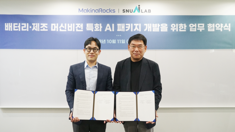 엔터프라이즈 AI 스타트업 마키나락스(공동대표 윤성호, 이재혁)와 스누아이랩(SNUAILAB, 대표 유명호)가 ‘배터리·제조 머신 비전 특화 AI 패키지 공동 개발’을 위한 양해각서(MOU)’를 11일 오전 10시 서울 서초구 마키나락스 사옥에서 체결했다.