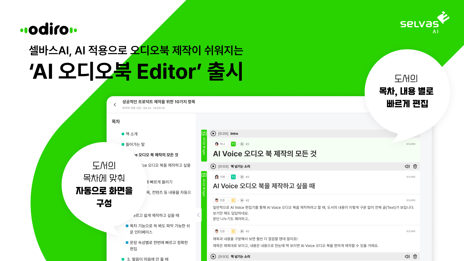 AI 목소리 콘텐츠 제작 서비스인 오디로(odiro)를 기반으로 한 ‘AI 오디오북 Editor’는 인공지능 기술을 접목하여 오디오북 제작 환경에 최적화한 AI 오디오북 전문 제작 툴이다. 딥러닝 기반 음성합성 기술과 AI 문서 분석 기술 등 인공지능 기술을 적용하여, 출판사 등 사용자가 직접 쉽고 빠르게 오디오북을 제작할 수 있다. ‘AI 오디오북 Editor’ 활용 시 90% 이상 빠르게 제작할 수 있다.