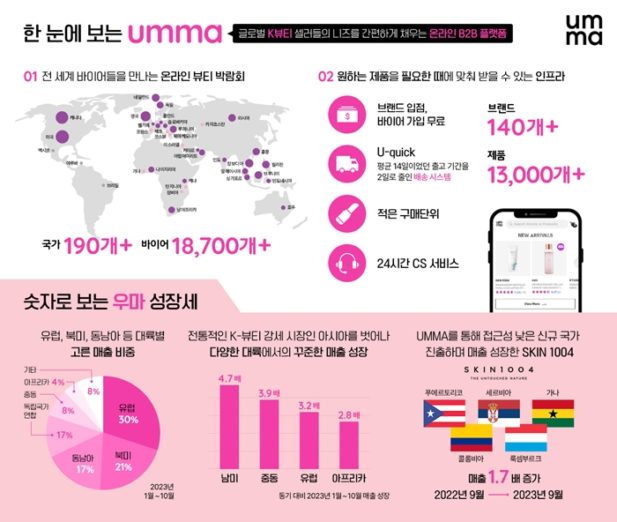 지난 2020년 런칭한 ‘우마’는 전 세계 190개 국가의 약 18,700명 이상의 바이어를 회원으로 보유한 B2B 뷰티 전문 커머스 플랫폼이다. K-뷰티의 주요 수요 국가들은 물론 가나, 탄자니아 등 아프리카 대륙과 코소보, 폴란드 등 유럽 지역에 이르기까지 폭넓은 B2B 네트워크를 보유, 인디 브랜드들이 추가 비용 없이 글로벌 채널을 구축하고 해외 소비자들의 반응을 살펴볼 수 있는 ‘온라인 뷰티 박람회’로 자리매김했다.
