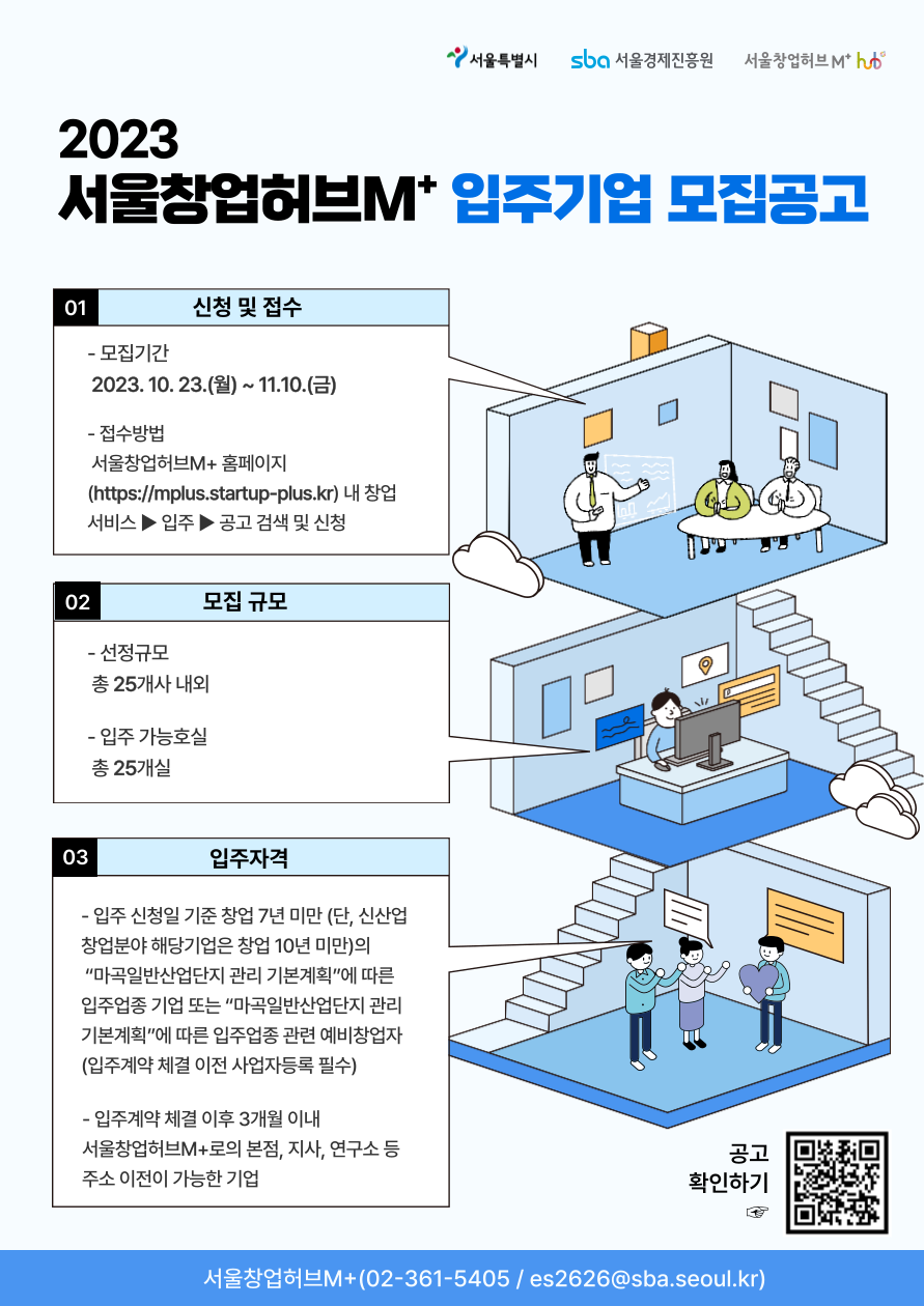 서울경제진흥원(SBA)이 오는 11월 10일까지 ‘2023년 서울창업허브M+ 신규 입주기업 25개사’를 모집한다.